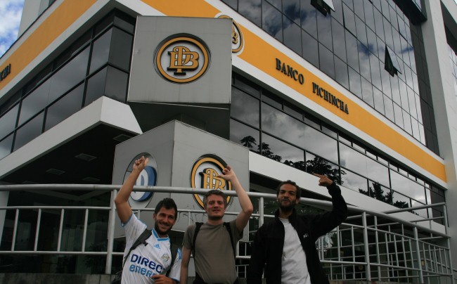 Une journée sans avoir affaires à la banque ne serait pas une vraie journée... Tout commence par Ptit Vince qui découvre que sa banque va mettre en opposition sa carte visa premier demain. Cool... Les appels de Ptit Vince seront inutiles, la transaction est irréversible... Ça vaut le coup d'avoir une visa premier et de se retrouver au bout de 2 jours dans un pays sans carte... Heureusement, que nous sommes 4... Vient notre tour de retirer la somme manquante pour la croisière qui débute demain. Nous faisons la queue dans une première banque qui veut nous facturer 80$ un retrait de 2000$, nous oublions et allons petit déjeuner. Pas de prise de tête le ventre vide. Je pars ensuite avec Ptit Vince à la banque boliviarano où nous faisons la queue pendant 1h pour s'entendre dire que je n'ai pas le solde suffisant... C'est à devenir fou ! Finalement c'est la banque Pinchincha qui nous sauvera, j'ai pu faire 6 retraits consécutifs sans avoir à remettre ma carte... si nous avions su nous serions venu là directement.