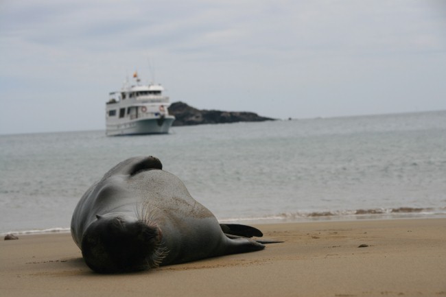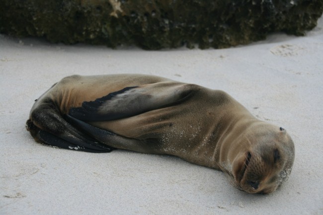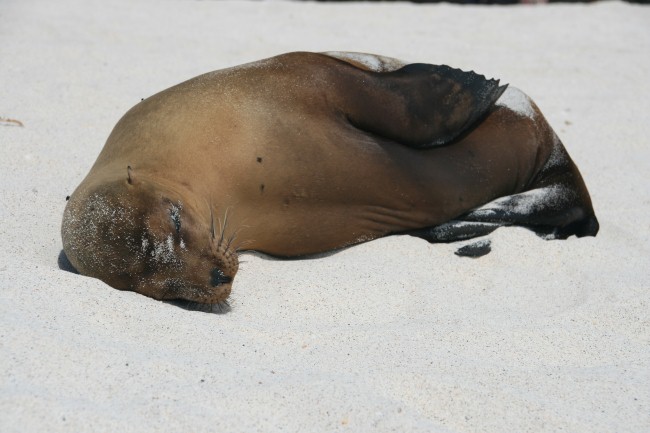Le grand jour est enfin arrivé ! Ce matin nous partons pour les Galapagos. Nous quittons l'hôtel vers 8h45. Nous savons que nous reviendrons puisque nous laissons un sac avec nos affaires. Nous aimons tellement Guayaquil... Nous partons à l'aéroport domestique. Nous avons plusieurs formalités à réaliser avant de pouvoir faire le check in. Première : faire inspecter notre bagage au poste SICGAL, il est ensuite scellé. Second : Payer l'INGALA card, taxe d'aéroport de 10$. Enfin nous pouvons faire le check in... Le chat va une dernière fois au distributeur, cela va quand même nous manquer de ne pas voir de banque pendant 10 jours... et c'est parti. Nous voyageons avec LAN. Dans l'avion très peu d'équatoriens. On se croirait en Europe... Nous arrivons aux Galapagos à 11h45, il y a une heure de décalage horaire avec le continent. Nous payons l'entrée du parc national qui s'élève à 100$ et posons enfin le pied sur l'archipel tant convoité. Notre guide est là. Nous prenons le bus jusqu'au port de Baltra. Les autres touristes sont déjà sur le bateau, nous sommes les derniers. Nous faisons leurs connaissance sans pour l'instant mémoriser qui est qui. Pas le temps de se familiariser avec le bateau, le déjeuner nous ait servi à tous les 4. Les autres ont déjà déjeuné. Le repas de poisson est super bon, c'est de bonne augure pour la suite. Une fois le déjeuner servi, le bateau repart et nous découvrons nos cabines dans la partie inférieure du bateau. Il fait chaud, moite, ça sent l'essence. Nous ne sommes pas très rassurés pour la suite. Enfin il est déjà l'heure de faire notre première activité : îlet Mosquera. Cette île est peuplée de lions de mer. Nous apercevons de loin ces mammifères se relaxant sur la plage, nous sommes même escortés jusqu'au rivage. Arrivés sur l'îlet nous avons un temps libre pour nous balader. L'île est toute petite (120m sur 600m). Nous voyons un nombre incroyable de lions de mer sur la plage et dans l'eau. Ils sont trop chouchous ! Cette façon qu'ils ont de se prélasser est trop drôle à voir. Nous voyons également un iguane marin, d'énormes pélicans.