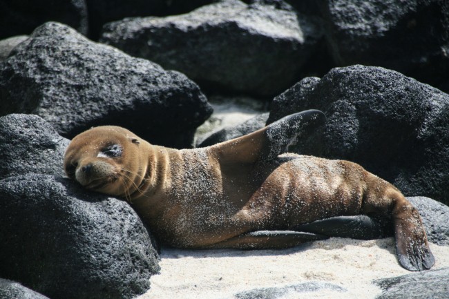 Nous rentrons également dans une petite grotte qui est en réalité le cratère d'un volcan. Nous terminons le snorkeling en palmant jusqu'au bateau. Nous sommes frigorifiés. Nous avons un petit temps libre pendant lequel nous grignotons et nous nous changeons. Nous allons ensuite faire une balade sur l'île sombrero Chino qui s'appelle comme ça car le volcan présent sur cette petite île à la forme d'un chapeau chinois. Nous vivons nos derniers moments avec les lions de mer. Nous prenons toujours autant de plaisir à les admirer. Il y a quelques petits bébés trop attendrissants.