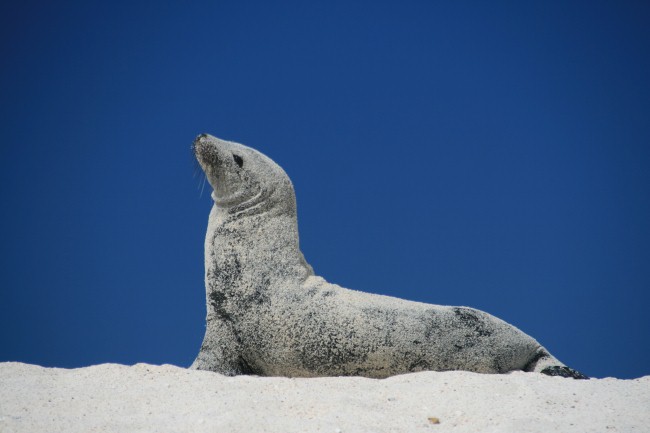 De retour sur le Darwin, le capitaine nous autorise à faire des sauts depuis le bateau. Sensations garanties ! Puis nous déjeunons. Toutes ces émotions ça creuse ! Après le déjeuner nous filons plus au sud de san cristobal. Fait incroyable, nous voyons des baleines dont une très proche du bateau, apparemment ce n'est pas encore la saison. Elles sont impressionnantes. Nous avons de la chance. La magie ne s'arrête elle donc jamais au Galapagos ? Nous arrivons au Cerro Brujo (colline du sorcier) d'où part une magnifique plage de sable blanc. Nous accostons et marchons le long de cette plage paradisiaque. Toujours quelques lions de mer pour nous attendrir, des crabes rouges, des crabes couleur lave et un sable fin doux pour les petits petons... Après la balade, nous nous accordons une baignade fraiche.. puis nous retournons sur le bateau. Des amuses bouches nous sont proposés, nous en profitons pour sortir le pastis. Le diner est servi dans la foulée. Ce soir c'est pizza ! Nous passons une soirée tranquille posés dehors à admirer les étoiles...