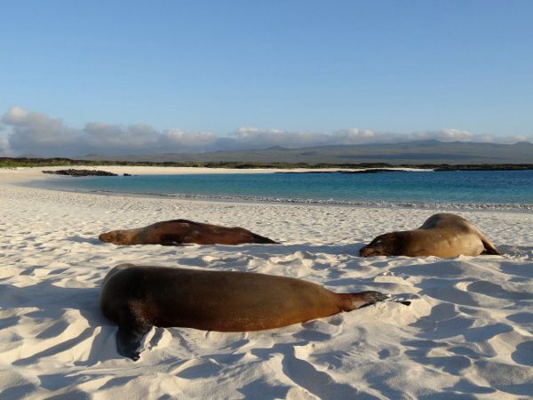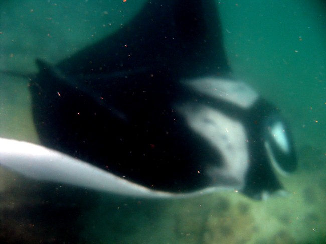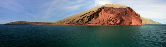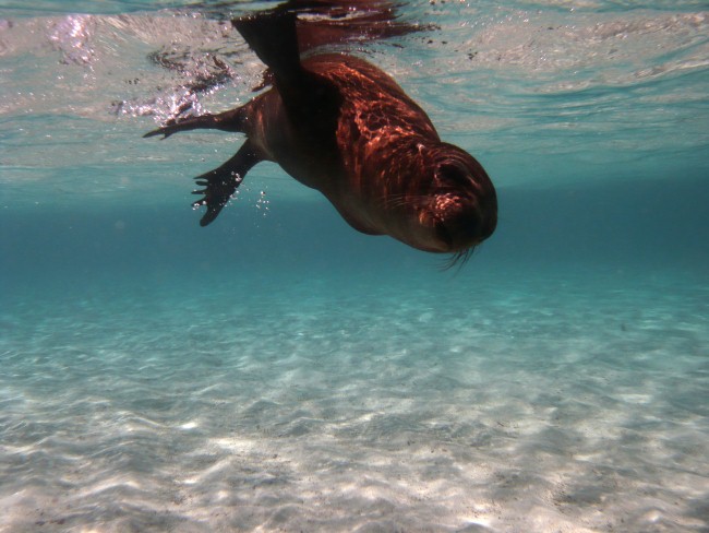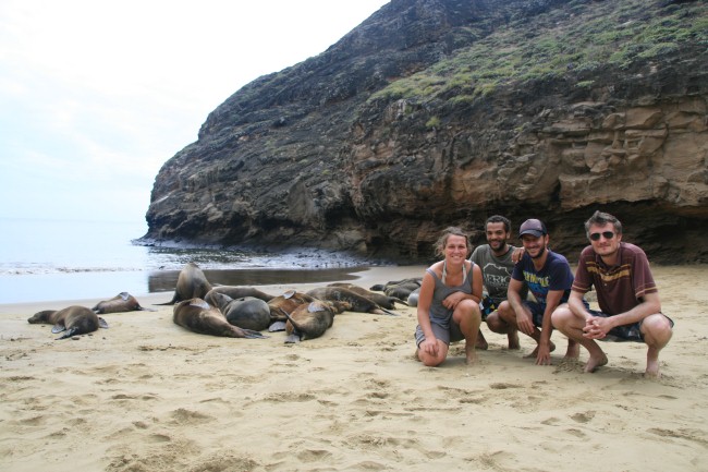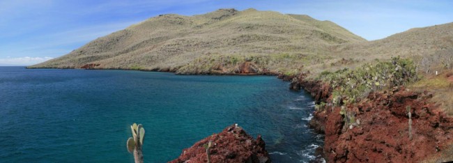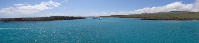 Nous nous retrouvons sur la plage peuplée de quelques lions de mer dont un petit bébé trop chouchou. Il venait vers nous vraisemblablement très curieux de notre visite. Derrière la plage, une jolie lagune d'eau salée avec en arrière fond le pic volcanique culminant de l'île. Nous continuons dans le cœur de l'île très contrastée entre la roche rouge volcanique et la végétation aride verdoyante sur un décor marin... De retour sur la plage, nous enfilons nos affaires de snorkeling. Nous prenons le dinghi, et nous rendons de l'autre côté de l'île (que nous avions atteint à pied). L'objectif étant de faire le retour à la nage jusque la plage. La visibilité n'est pas très bonne, l'eau est froide ! Nous voyons tortues, lions, de mer, requin, jolies étoiles de mer, sting ray. A un moment, donné le trajet nous semble à tous un peu long, l'eau est froide et on ne voit plus grand chose jusqu'au moment où le guide s'écrie « Giant Manta Ray !!! », « quoi ???». Et là, nous voyons l'élégante raie manta passer sous nos corps qui semblent bien petits à côté des ailes géantes. Elle est impressionnante et d'une beauté... Elle passe furtivement, à tel point que seule la moitié du groupe la voit. Heureusement, elle fait demi tour et nous offre un nouveau passage qui permet à tous d'en profiter. Quel bonheur de faire une telle rencontre sous l'eau ! Incroyable !