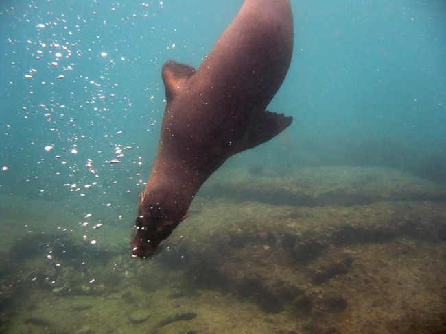 Nous voguons ensuite vers l'île des lions de mer (Isla Lobos) qui comme son nom l'indique accueille une colonie de lions de mer. Nous commençons par faire un snorkeling accompagnés de quelques lions de mer. Un jeune lion de mer joue avec nous pendant plusieurs minutes.