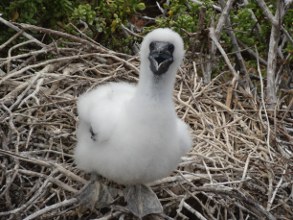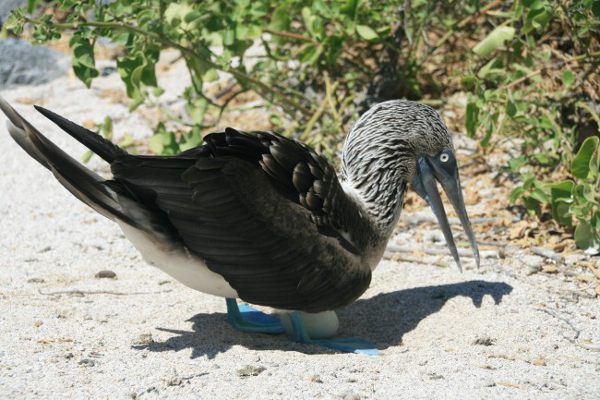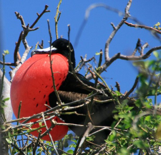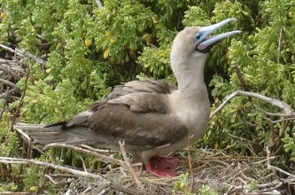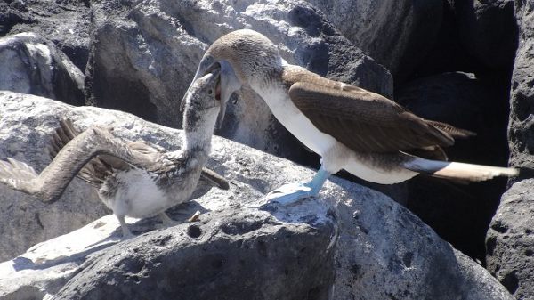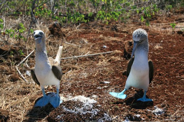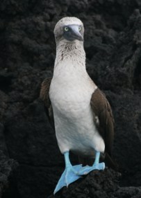 Nous apercevons sur la rive un blue footed booby (fou à pieds bleus). De retour sur le bateau, nous continuons à admirer le spectacle des lions de mer qui jouent ainsi que les tortues qui se promènent près du bateau. Nous déjeunons et nous rendons ensuite sur l'île. L'objectif étant d'aller à la rencontre des blue footed booby. Nous ne sommes pas déçus de la balade. A peine arrivés sur l'île, nous retrouvons des frégates mâles fiers de gonfler leurs poches rouge pour séduire les femelles, nous retrouvons ensuite les blue footed booby qui nous offre une parade amoureuse des plus dansantes... Nous croisons plusieurs femelles couvant précieusement leur œuf et assistons également au repas d'un petit avec sa maman.