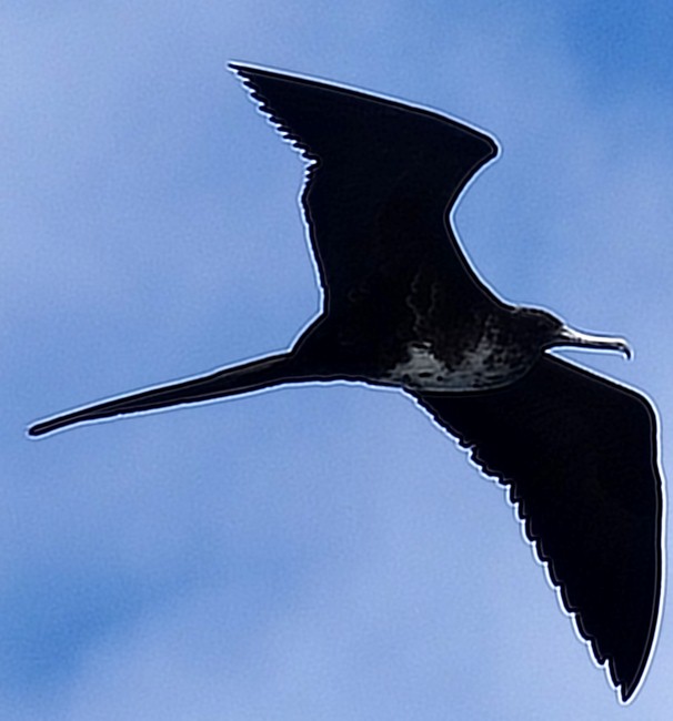 La balade remonte jusqu'à un joli point de vue sur l'île. De retour sur le bateau, certains s'amusent à faire des sauts. Nous reprenons le bateau et voguons jusqu'à la baie des tortues noires (caleta tortuga negra). Le coucher de soleil est splendide, nous sommes accompagnés de frégates. Nous arrivons en fin de journée et apprécions le calme de la mer. Nous dinons un excellent repas de morue et passons une soirée tranquille à papoter admirant par dessus bord les lions de mer « fusée »...