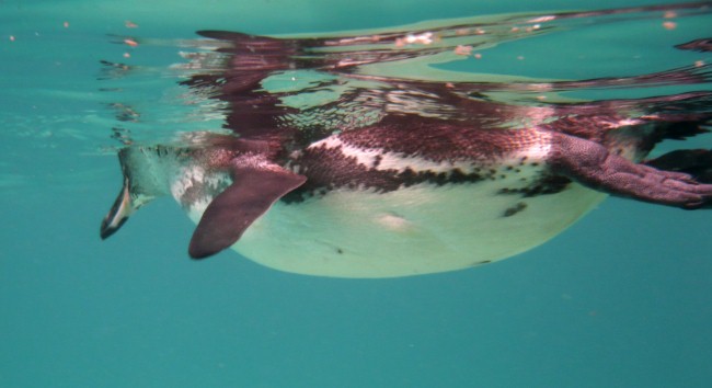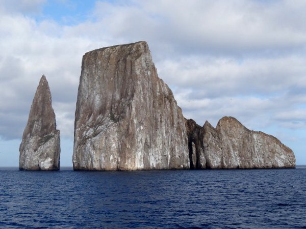 Nous voyons deux bébés raies aigles, un requin. La balade est sympa. De retour au bateau, nous avons un temps libre que chacun exploite à sa façon. Les autres rentrent vers 11h30 et c'est déjà l'heure de déjeuner car ensuite le bateau redémarre pour nous amener sur l'île de Santiago à l'îlet sombrero chino. La mer est calme. La traversée est tranquille. Petite sieste. Réveil pour faire du snorkeling au bord de l'île de Santiago. La motivation n'est pas très présente, le temps est bien couvert, l'eau promet d'être froide... Mais bon c'est le dernier snorkeling, donc on y va ! La mise à l'eau est délicate mais il y a tout de même une bonne visibilité. Nous voyons requins pointe blanche, lion de mer et le clou du spectacle est la présence de pingouins. Ils sont assez vivaces, c'est sympa de les voir sous l'eau.