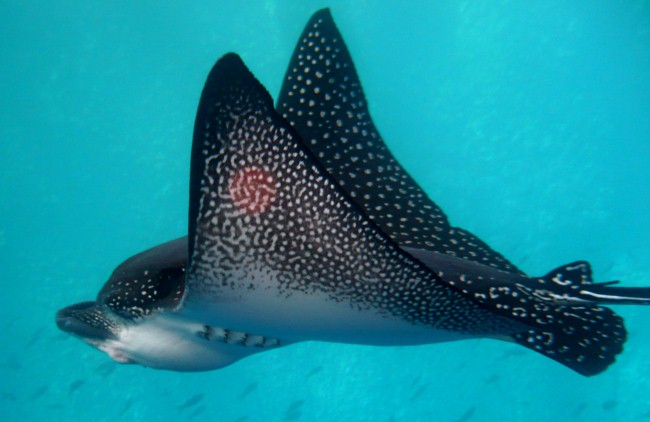 Vient ensuite l'heure du snorkeling. La mer est un peu agitée mais cela ne freine pas nos ardeurs. Bien nous en a pris... Le snorkeling est magnifique : énormes banc de poisson, beaux perroquets, tortues, lions de mer. Le clou du spectacle se déroule dans la faille du rocher où nous assistons au ballet de raies aigle et de requins des Galapagos. Quelle élégance ! Nous sommes émerveillés par ce spectacle.