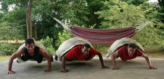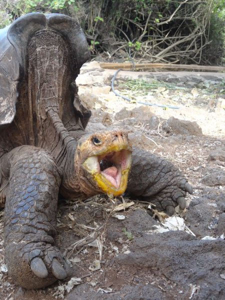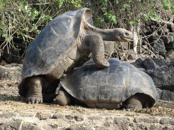 Lever 6h, dur dur ! Départ 6h30 pour la station de recherche Charles Darwin. Ce lieu possède un centre d'élevage de tortues (œufs prélevés sur les îles, tortues élevées jusqu'à environ 4 ans puis relâchées dans leurs îles d'origine), un programme de reproduction de tortues géantes ainsi que également un programme de protection d'iguanes terrestres et certainement bien d'autres choses... C'est l'occasion pour nous d'observer toutes ces espèces. Les tortues géantes sont vraiment impressionnantes ! Nous avons le droit au spectacle d'un mâle essayant de s'accoupler avec... un autre mâle. Faute de femelle à portée de main il faut bien s'occuper...