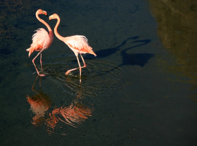 Nous remontons sur le bateau pour déjeuner. Dans l'après midi, nous allons sur l'île d'Isabela. Nous nous affranchissons de la taxe de 20$ à Puerto Villamil et prenons une chiva : gros camion pour rentrer dans les terres. Le premier spot que nous visitons est le site historique du Mur des Larmes. Ce mur de roches volcaniques fut construit par des prisonniers dans des conditions terribles. Le centre pénitentiaire a fermé en ses portes en 1959. La nature reprend peu à peu ses droits, le site est habité de grosses tortues terrestres. En chemin, nous passons par une lagune où quelques magnifiques flamants roses s'alimentent sans relâche.