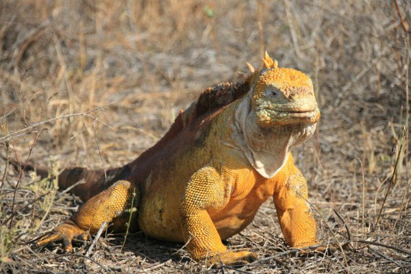 En retournant sur la plage, nous voyons un gros requin qui attendait vraisemblablement le faux pas d'un bébé lion de mer... Encore une fois quel snorkeling ! De retour sur le bateau, nous déjeunons et reprenons la mer, nous nous rendons au nord de l'île de santa cruz. Nous avons environ 2h de traversée, chacun vaque à ses occupations. Nous arrivons sur le site de Cerro Dragon avec un joli bord de mer volcanique. Juste derrière la plage, une belle lagune « peuplée » de 2 flamants roses. Nous faisons une petite balade traversant une forêt de palo santo et de cactus géants. Nous rencontrons de beaux iguanes terrestres caractérisés par leur couleur jaunâtre.