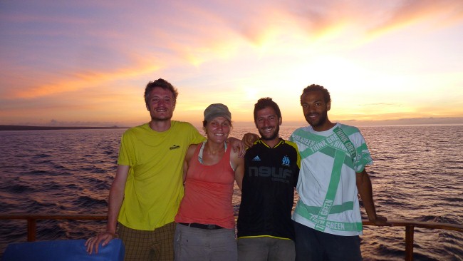 Le ton est donné pour cette croisière. La nature avec un grand N s'offre à nous et nous comptons bien en profiter. Nous enchainons ensuite avec un snorkeling au sud de l'île de Seymour Nord. Beaucoup d'oiseaux dans les cieux et dans l'eau de jolis poissons ange, trompette et d'autres dont nous ne connaissons pas le nom. Nous voyons même un poisson scorpion et Vince et moi voyons passer un lion de mer à la vitesse de la lumière...:) En remontant sur le bateau, nous sommes accompagnés d'une frégate qui bombe sa poche rouge comme pour nous séduire ! C'est incroyable, en à peine un après midi la quantité d'animaux observés. De retour sur le bateau, le capitaine met cap sur le port de Baltra où nous sommes arrivés ce matin. Ils ont besoin de récupérer de l'eau et des vivres. Pendant ce temps, nous admirons les pélicans pêchant. Ces oiseaux ont une sacrée dextérité ! Une fois, les « corvées réalisées » nous reprenons la mer et nous nous posons à la « canalita vaca » (le petit canal de la vache). Nous faisons un briefing pour la journée du lendemain suivi d'un cocktail de bienvenue « PinkFloid » : pastèque, rhum, citron... Pas mauvais du tout... Le diner est ensuite servi, toujours aussi bon ! Dans la soirée, nous restons posés dehors. Le capitaine a mis le turbo, cette nuit, nous avons la plus longue traversée du voyage entre Baltra et l'île de san cristobal. Du coup ça secoue. Nous avons tous une petite appréhension pour la nuit...