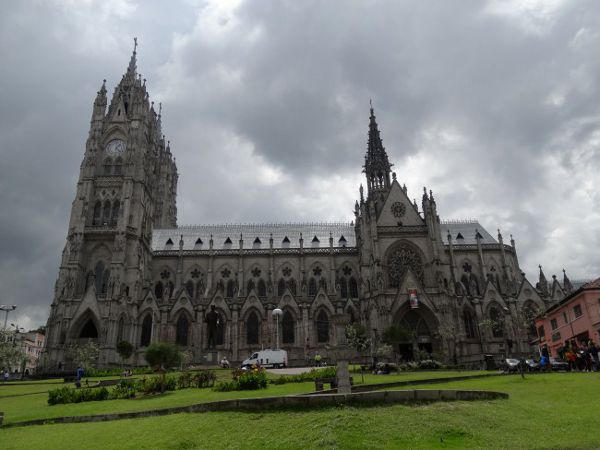 Nous découvrons qu'aujourd'hui est la fête nationale de l'Équateur, c'est donc un jour férié avec toutes les conséquences liées... Nous partons nous balader dans le vieux Quito. Les forces de l'ordre sont omniprésentes en ville. Nous passons par hasard par le siège du gouvernement, toutes les forces militaires sont représentées, nous demandons ce qu'il se passe et là nous apprenons que le président Raphael Correa « fête » sa réélection entourés de tous les plus hauts dirigeants d'Amérique Latine (et quelques uns du monde...). Un défilé est prévu. Nous continuons notre balade et arrivons au vieux Quito passant par la « Basilica del Voto nacional » et suivant les belles bâtisses coloniales.