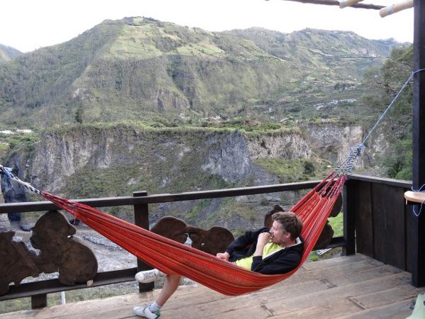 Réveil sous les averses, ciel totalement bouché, ça ne sent pas bon pour notre plan quilotoa. Les prévisions météo ne sont pas bonnes du tout. Nous changeons de stratégie et décidons d'aller à Banos, nous verrons bien si la situation s'améliore dans quelques jours. Nous allons à la gare routière. Là on nous atteste qu'il n'y a pas de bus direct pour Banos et qu'il faut d'abord aller à Ambato. Bon soit, nous prenons donc un premier bus pour Ambato. Arrivés là bas, apparemment, nous devons changer de terminal (contrairement à ce que nous avaient dit les personnes de Latacunga). Finalement, nous parvenons à négocier pour monter dans un bus allant à Puyo (après banos). En chemin, nous avons la chance d'apercevoir le volcan actif de Tungurahua. Nous arrivons enfin à Banos et sommes agréablement surpris par cette jolie petite ville entourée de montagnes. Nous traversons cette petite bourgade, une personne d'une agence nous aide à trouver notre chemin. Nous trouvons une superbe auberge de jeunesse : Hostel Chimenea. Très propre, joliment décorée avec une jolie terrasse avec vue sur une cascade. Nous profitons pour y déjeuner. Prévoyant de faire de la rando au quilotoa, nous sommes équipés ! Nous partons dans l'après midi voir le mec de l'agence qui nous avait aidé pour voir ce qu'il propose. Le feeling passe très bien avec lui, il est super gentil. Nous convenons de louer des vélos le lendemain. Le cadre naturel autour de Banos étant riche, nous souhaitons nous balader. Lorsque nous lui demandons des conseils pour les marches alentour, il nous propose spontanément d'aller chez un ami à lui d'où apparemment nous avons une vue superbe sur le volcan. Au début, nous sommes un peu méfiant, mais quelque chose nous pousse à lui faire confiance. Il nous explique que son objectif est de partager avec les personnes comme nous son amour de l'Équateur car lui même vient de Colombie. Nous partons avec lui, un de ces amis nous prend dans un pick up et nous voilà partis chez Marcelo avec Alfonso et ses 2 enfants. Nous faisons la rencontre de Marcelo qui vit un peu à l'extérieur de la ville. Il a bâti sa maison en bois qui est magnifique avec une vue splendide sur le volcan (en théorie car là c'est couvert....). Il a également bâti des toilettes originales... sacré personnage ! Nous passons un super moment.
