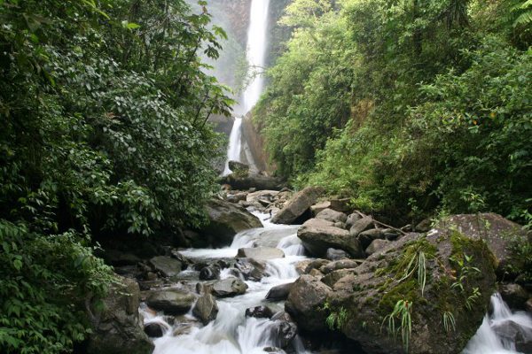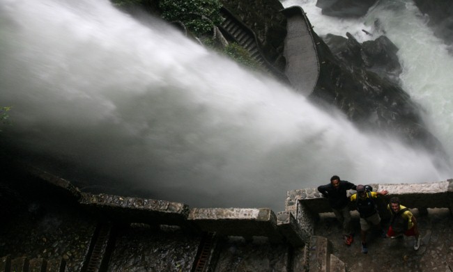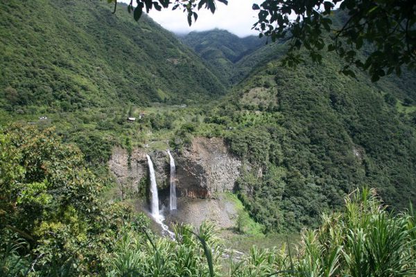 Beaucoup de point d'intérêt sur la route. Nous faisons un premier arrêt au barrage de Agoyan où nous allons visiter une première petite chute. Puis nous marquons un arrêt aux chutes d'Agoyan qui sont plus spectaculaires que les premières. Nous passons à travers un premier tunnel et contournons les autres par de superbes pistes cyclables se trouvant aux bords de ravins. Plusieurs points, d'où nous pouvons nous élancer pour faire du canopy, nous assistons au départ de l'une d'entre elles qui semble vertigineuse. Nous nous arrêtons ensuite à la cascade « Manto de la novia » que l'on peut approcher après une courte descente en contrebas. L'arrêt suivant se trouve au village de Rio Verde et sa célèbre cascade «Paillon del Diablo ». Nous marchons sur le sentier aboutissant à un point de vue au plus près de la chute. Le débit est phénoménal !
