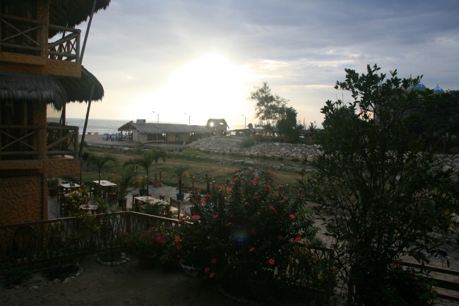 Encore une fois, le mauvais temps nous joue des tours... Lever à 5h, motivés pour retourner aux thermes, il pleut ! Cela ne freine pas notre motivation pour le bain en revanche, nous nous posons des questions par rapport à nos envies de canyoning ou de forêt... Bon, nous verrons en temps voulu, place à la relaxation. C'est fou le nombre de personnes déjà présentes à cette heure là ! Nous restons une bonne heure alternant entre bassin froid et bassin chaud, restant tout de même un peu plus dans le chaud il faut bien l'admettre. De retour à l'hôtel, nous nous posons quelques minutes avant d'aller petit déjeuner. Nous repassons voir Alfonso et lui faisons part de nos doutes existentiels sur le climat. Il nous confirme qu'il est risqué de prévoir quoi que ce soit pour aujourd'hui. Cela va dans le sens de nos pensées. Nous décidons de quitter définitivement cette région et de retourner à la mer pour passer nos derniers jours avec Vince et le chat au soleil. Nous partons nous renseigner au terminal sur les horaires de bus et retournons préparer nos affaires à l'hôtel. Une dernière bise à Alfonso et nous voilà dans un bus pour Guayaquil. Le conducteur est un vrai chauffard. Le paysage est très sympa, nous avons même la chance d'apercevoir le Chimborazo, point culminant de l'Équateur. Nous arrivons à Guayaquil en fin de journée, nous apprenons qu'il n'y a plus de bus pour Montanita. C'est la tuile. Nous étudions tous les scénarios possibles et finalement c'est le chat et Vince qui débloque la situation en négociant un taxi... 80$ la course pour faire 150km, cela reste raisonnable et surtout cela nous permet de nous échapper de Guayaquil. Nous voilà partis, nous repassons chez Dreamkapture récupérer notre sac et nous prenons la route de la côte. Comme tout bon conducteur qui se respecte, il roule en plein fard, le pied sur la pédale, double par la droite, pile au dernier moment pour prendre un ralentisseur... C'est un sacré soulagement que d'arriver enfin à Montanita vers 23h. Yoann et le chat nous dégote un petit hôtel super sympa avec vue sur la mer. Nous avons la sensation d'avoir changé de pays, musique de rue, vendeurs bohème, tenues légères, paillottes, surfers... Nous allons fêter notre arrivée en buvant un ptit rhum ensemble. Exténuée, je pars me coucher tandis que les hommes continuent à faire la fête.