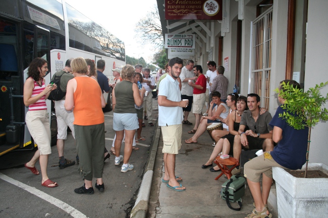 Route vers le SanBonani hotel. Nous avons eu un premier problème d’autocar en panne… Nous ne nous sommes pas laissés aller pour autant, une ambiance très sympa c’est instauré dans la rue, djembé sorti, pastis, tarot. La fête était au rdv, limite l’autocar a été réparé trop rapidement. Pour se faire pardonner la compagnie de bus nous a offert de la liqueur d’amarula. Très sympa.