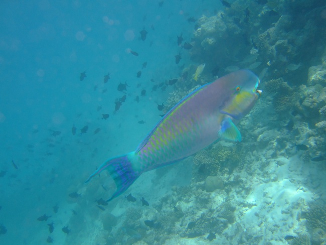 Lever 9h… Petit snorkeling au bout de l’île. Corail bien fourni, pas mal de poisson. Nous revenons vers 12h. Trop tard pour récupérer la navette de 12h30 pour Sun island. Nous ne voulons pas nous presser et restons à patauger dans l’eau… nous nous posons sur les transats. Nous déjeunons. Départ pour Sun Island à 15h. Snorkeling au resto Italien : énormément de variétés de poissons, pleins de poissons perroquets énormes et le clou du spectacle est un requin zèbre. Nous nous baladons ensuite sur l’île qui devait être notre île initialement. Nous la trouvons trop grosse, elle fait village de vacances, un peu usine à touristes. Nous sommes contents d’être sur la notre, nous rentrons la retrouver.