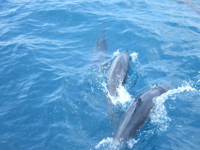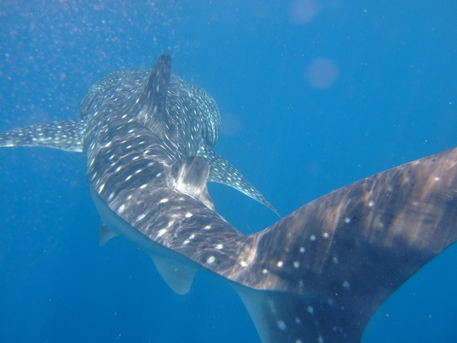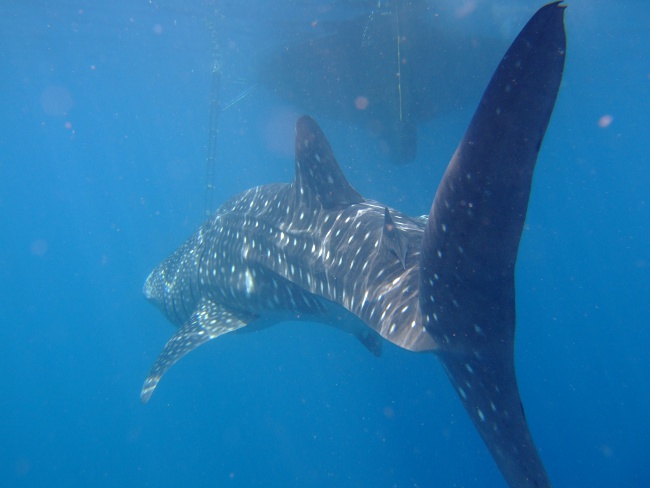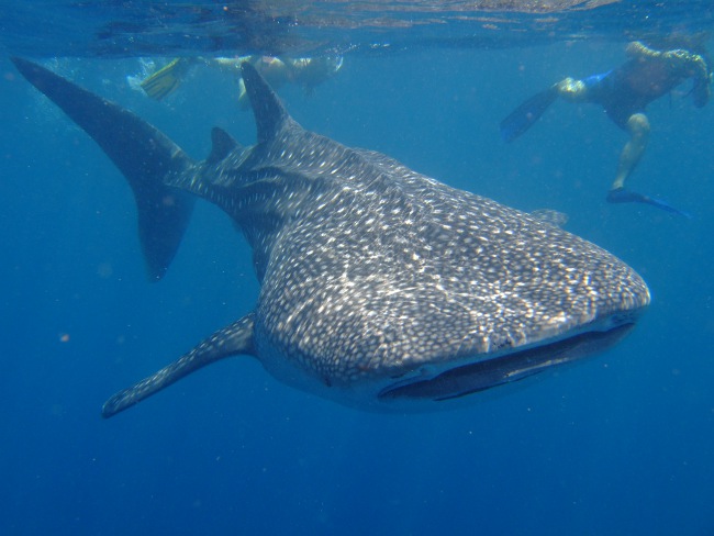 Snorkeling de 3h durant le matin. Magnifique: poisson scorpion, sèche, murène à foison, poisson clown, beaux bancs de poisson, jolis coraux. Spot vraiment sympa. Nous avons le choix de faire un second spot de snorkeling mais nous préférons aller à la quête du requin baleine. Nous avons eu l’immense chance d’en voir un ! Moment unique, inoubliable, magique. Nous avons nagé avec lui durant 5 à 10 minutes. Moment de vraie zénitude. Au retour nous croisons des dauphins. Quel chance !