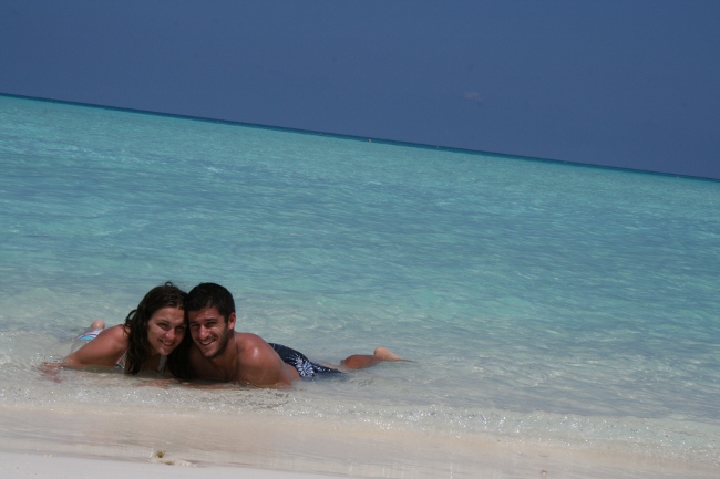 Nous partons pour Colombo au Sri Lanka à 11h25, arrivée prévue 4h du matin heure locale. Dur dur l ‘escale au Sri Lanka, nous sommes épuisés. Départ pour Malé, la capitale des Maldives à 9h25 pour 1h d’avion. Arrivés à Malé à 7h du matin (heure française), nous prenons un bateau pour rejoindre notre île : Holiday Island sur l’atoll d’Ari. Au bout de 2h30 de bateau, nous arrivons sur notre île : grand ponton, eau transparente magnifique, petit cocktail de bienvenue. Nous découvrons notre bungalow au bord de l’eau. Nous nous accordons une petite baignade : eau chaude, un rêve. Nous tombons sur des requins pointe noire, trop beau. Le tour de l’île est assez vite fait, coucher du soleil à la pointe de l’île. Diner à l’hôtel. Balade sur le ponton. Il y a beaucoup de poissons, des raies. Nous sommes super heureux.