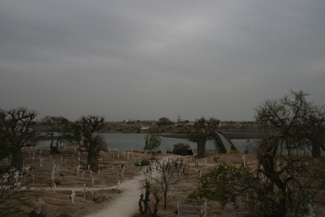 Nous sommes déposés au cimetière de Fadiouth, mélange catholique/musulman avec unevue sur les greniers à mil. C’est très beau, nous nous rendons sur l’île de Fadiouth, l’île coquillage.