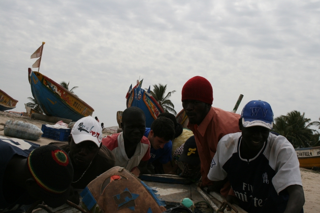 Nous avons passé une partie de la journée sur la plage de Djiffer. Nous traversons ce village haut en couleur et en odeur… Arrivés aux pirogues, nous vivons un moment atypique. Nous embarquons, la pirogue est pleine (15-20personnes). Les hommes sont obligés de redescendre pour pousser : Assilié !!! Hé !!! Aimoduc !!!