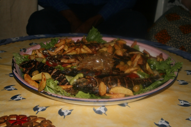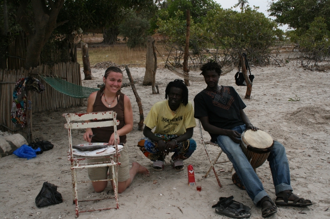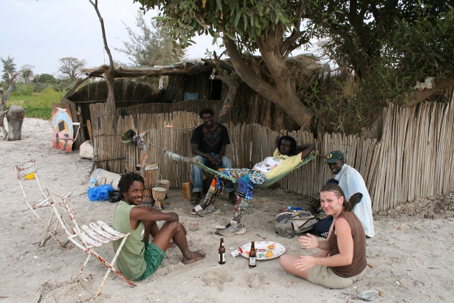 Puis nous partons en pirogue nous balader dans les îles du Saloum. Arrêt à Falia, traversée du village puis nous récupérons une petite pirogue (à rames) qui nous permet de traverser des bolongs étroits. Nous avons vu un singe et plusieurs oiseaux, nous sommes retournés à notre pirogue principale direction Dionewar. Arrivés sur une plage magnifique, nous déposons nos bagages dans la maison où nous allions passer la nuit. Direction chez Mady, petite hutte devant la plage où nous avons rencontré des baïfalls : Mady, Abdulaye. Nous avons également rencontré Lamine. Au programme, déjeuner, chant, djembé et danse. Moment inoubliable. Nous préparons le poisson que nous avons grillé avec une sauce aux oignons crus, moutarde, sel, poivre, vinaigre, knor et citrons. Délicieux.
