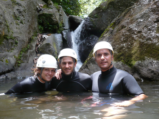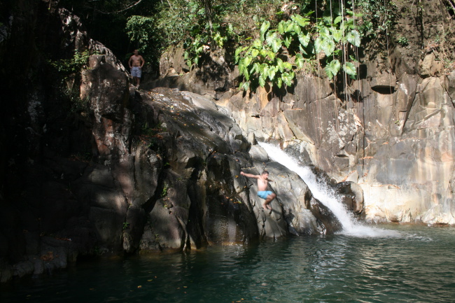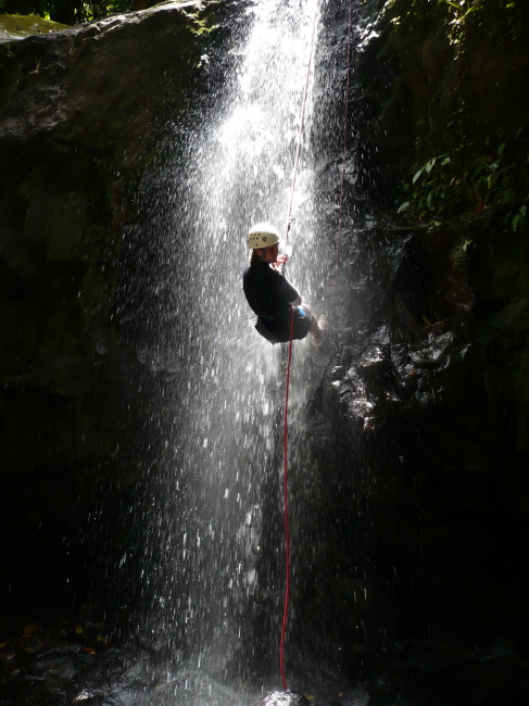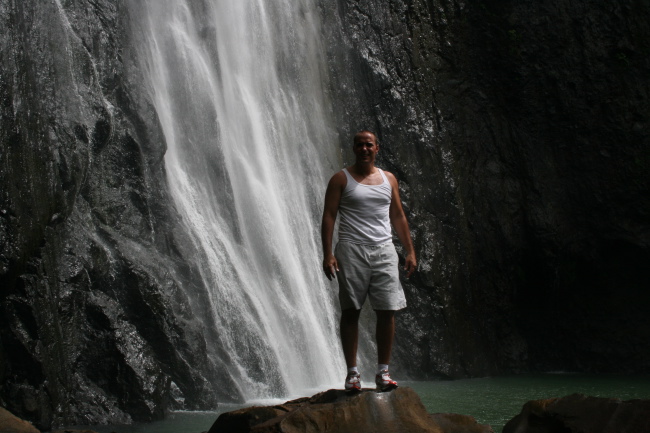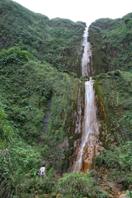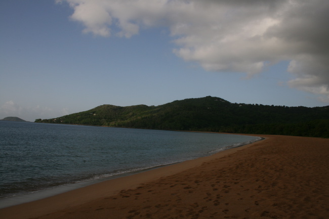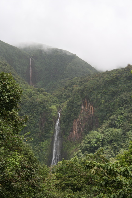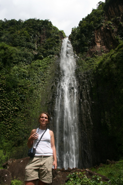 Levé 6h50 au lieu de 6h20… trop dur. Petit dej tranquilou. Puis nous nous sommes dirigés vers Basse Terre pour attaquer l’aspect rando. C’était assez couvert, nous nous sommes arrêtés d’abord aux chutes du Carbet. Nous avons fait la deuxième chute qui ne se gagne pas, elle est pourtant très très belle, nous avons transgressé le parcours pour aller vraiment au pied de la chute… Magnifique, elle s’élève à 120 mètres (à vérifier). Puis nous nous sommes dirigés vers la Première chute du Carbet, celle là se mérite beaucoup plus, sentier un peu plus délicat, boue, roche glissante, traversée de rivière mais dans l’ensemble ça allait car il n’avait pas trop plu les jours précédents et le temps était assez clément malgré que ce soit couvert… La chute est magnifique dans les tons orangés (à cause de l’oxydation), en plus nous étions seuls l’arrivée, elle était bien dégagée. Superbe. Puis d’autres personnes sont arrivées, nous sommes partis et la chute se couvrait de nuages. Je plains les personnes que nous avons ensuite croisées et qui s’y rendaient… D’ailleurs au démarrage des traces on aperçoit les chutes et quand nous sommes revenus au point de départ on ne voyait plus la première chute. Retour assez délicat, je suis tombée pas mal de fois, j’étais pleine de boue…Franchement c’était super. Nous sommes repartis des chutes du Carbet mais il était trop tard et c’était trop couvert pour faire la Soufrière. On a décidé de faire le tour de Basse Terre par l’Ouest. Nous ne l’avions pas encore fait. Nous sommes passés par Basse Terre ville… Nous nous sommes arrêtés pour déjeuner chez Dada juste avant Malendure où nous avons mangé accras, fricassée de chatroux (poulpe) et glace coco, délicieux. Nous sommes partis au club de plongée pour nous inscrire pour Mercredi et nous sommes retournés au Canyoning où Morgan s’est inscrit pour jeudi, Yo et moi on réfléchi encore… Puis on a continué notre tour de Basse Terre, en s’arrêtant à la plage de Leroux pour boire un petit fraichement pressé : Goyave. C’était bon mais j’avais tellement envie d’un jus d’ananas… comme à Saint Domingue…Tant pis, nous sommes repartis vers Deshaies et nous nous sommes arrêtés à la plage de Grande Anse, magnifique, nous nous sommes baignés et sommes restés jusqu’au coucher du soleil…un peu masqué sous les nuages… Nous avons fini notre tour de Basse Terre sous la nuit, nous sommes rentrés à la maison bien claqués par cette journée… Diner tranquille : pasta…Délicieuse !!!!