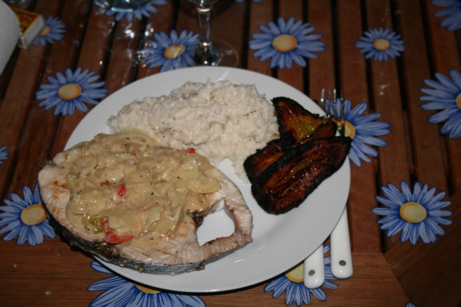 Finalement arrivés à Saint Anne, les mecs se décident d’aller à un magasin hifi pour trouver un câble pour l’appareil photo, je reste dans la voiture car je bookais pour les saintes pour le samedi, dimanche. Je les ai attendu une demi heure, j’ai cru que j’allais griller dans la voiture… Nous repartons et là on se dit et si on achetait du poisson pour ce soir… On fait demi tour. On achète un énorme poisson : œil de bœuf puis on fait le marché on achète des petits fruits (citron, ananas, tomates, avocat), on s’achète également des tourments d’amour (gâteaux locaux) et deux petits rhums arrangés : passion et coco. On retourne à l’appart pour préparer la marinade du poisson… Bilan on est reparti vers 12h30, on décide donc de rester sur Grande Terre. Direction Saint François, on pense avoir trouvé la plage du lagon, jolie mais un peu laisser à l’abandon. Puis on se dirige vers la plage des Mancenilliers (arbre dangereux), on pense également que c’était la bonne, L’eau était tellement belle vert bleu…puis direction la pointe des châteaux extrémité Est de l’île en passant par l’anse à la gourde… Anse à la gourde assez sauvage, mer assez agitée…C’était différent des plages de l’autre côté… puis nous sommes vraiment allés à la pointe des châteaux. Très jolie. On s’est baladé…Mais il faisait tellement chaud et on avait faim. Arrivés sur le parking, on prend tous les trois un sorbet passion, très bon. On se dirige vers Man Michel un petit resto recommandé par le guide du routard. Vraiment très bien, accueil très sympa. Les mecs ont pris le poisson grillé (deux perroquets) et moi j’ai pris une brochette d’ouassous saut chien…. Entrée copieuse (accras et légumes) et plat copieux, l’envie était à la sieste. On décide d’aller voir l’Anse Tarare juste à côté du resto, comme d’hab on fait d’abord le choix d’un chemin faux, on se retrouve au bord d’une falaise avec une mer très agitée… puis on voit des personnes avec des serviettes. On décide de les suivre… Mais cette plage est une plage naturiste… donc on n’est pas allé bien loin. Direction Saint Anne, plage des caravelles, décevant pour une plage qui est dite plus belle plage de l’île (plage du club med), pas super bien entretenu. C’est clair qu’elle a du potentiel quand même… Yoann et moi, on s’est baignés. Retour à la maison, posé…. La soirée a commencé calmement, nous n’avions pas faim après le gros repas du midi et nous avions peur de laisser le poisson pour le lendemain… Mais le rhum aidant avec Ti punch pour les mecs et délicieux rhum passion pour moi… Super soirée barbecue… poisson œil de bœuf + riz « parfumé » préparé par Yo et Morgan…Un vrai délice. En dessert melon, que chacun trempait dans son rhum. + croix rouge locale… Nuit agitée du coup….
