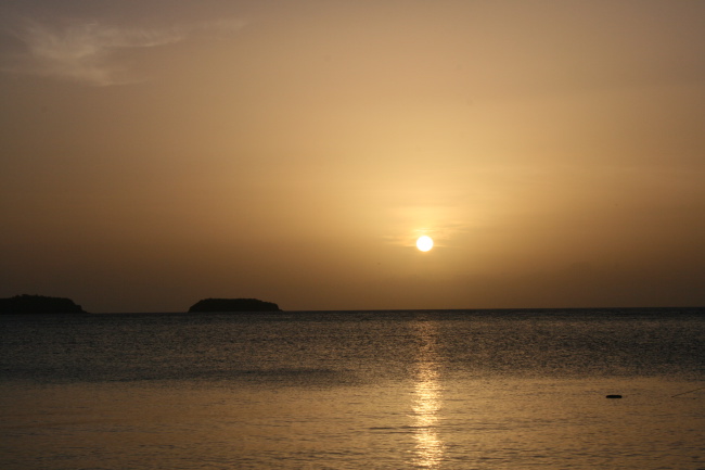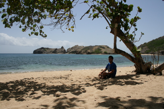 Lever 5h15… dur dur d’être en vacances… Départ vers 6h15 direction les 3 Rivières pour prendre le bateau pour les Saintes. Arrivée 7h25 aux 3 rivières, achats des billets puis nous avons mis la voiture dans le parking du débarcadère. Départ vers les Saintes vers 7h50… ça tanguait beaucoup. Arrivée aux Saintes direction le Gite «chez Pierrot » pour déposer nos affaires, accueil très chaleureux de Pierre et Brigitte, vraiment très sympas. Ils ont appelé le club de plongée pour annoncer notre arrivée, lesquels ont rappelé 5 minutes plus tard pour annuler la plongée du matin…pour cause d’otite d’un moniteur… du coup suite aux conseils de nos hôtes, nous nous sommes baladés dans les Saintes. Nous avons commencé par la balade du Chameau qui menait au sommet de l’île de Terre de haut, il n’était que 10h et déjà le soleil cognait dur, nous étions trempés et c’était très pénible de marcher par de telles températures. Arrivés au sommet, il y avait un fort et après une puis une deuxième échelle, nous voilà au sommet de l’île avec un panorama et une vue à 360°…. Superbe Magnifique. La Baie des Saintes est qualifiée comme la 3ème plus belle baie du monde par le guide du routard après Rio et Halong…C’est vrai que c’est vraiment joli. Puis nous sommes redescendus du fort et Morgan l’Aventurier nous a trouvé un chemin dans le maquis saintois… Descente en aveugle vers je ne sais où, c’était agréable surtout quand on a vu que c’était balisé…Vu sur une plage magnifique, nous sommes tombés sur la plage Crawen, très mimi, on s’est baigné puis nous sommes repartis, nous mourrions de faim et on avait plongée l’après midi. Sur le retour, on trouve le petit resto Escale Créole mortel il livre partout sur l’île… on s’est posé, Yo et moi on a pris un bokit Jambon Fromage qui déchirait !!! Morgan avait pris un poulet crudités…. Départ vers le club de plongée, on avait un bon bout de l’île à faire…encore sous le cagnard… On est repassé à la chambre, puis direction le club de plongée les Pisquettes et rencontre avec Petian notre moniteur de plongée. On est parti sur le site les Baleines, super sympa. J’ai mal géré ma plongée, manque d’expérience certainement, 35 minutes, 22m et les autres 47 minutes… Secret spot et canyon : diodon, barracuda, pour Morgan poisson coffre qui faisait bibi à la murène. Voir carnet de plongée. Arrivée sur le bateau Petian m’a donné quelques conseils à suivre… sympa. Retour au club, j’étais quand même un peu dégoutée… Enfin…Après la plongée on s’est fait une petite glace, on est reparti à la chambre pour déposer nos affaires et on a cherché le meilleur spot pour regarder le coucher de soleil, nous voilà donc reparti vers le sud de l’île vers la plage Pain de sucre super joli… (Rencontre avec la femme qu’on avait rencontré le matin sur la trace du chameau) Sauf qu’au moment de se coucher, le soleil s’est caché derrière les nuages. On a fait une petite balade de l’autre côté de la plage, y avait de la vie sur le chemin crabe et lézard… Retour à la maison pour se laver, on en pouvait plus de marcher. Petit resto au cœur de l’île «Toumbounda ??? », recommandé par le guide du routard, on a mangé coquille de poisson, boudin poisson grillé (daurade coryphène) avec pour les uns gratins de christophine et pour moi riz salade. Dessert flan coco. C’était super bon. On est allé prendre un verre « Chez Cécile » bar très animé des Saintes avec beaucoup de monde, bien plus que ce qu’on a pu voir de toutes les vacances… moi j’étais crevée les garçons m’ont raccompagné et ils sont repartis au bar. Après je ne sais pas…
