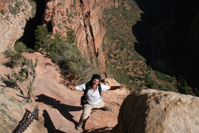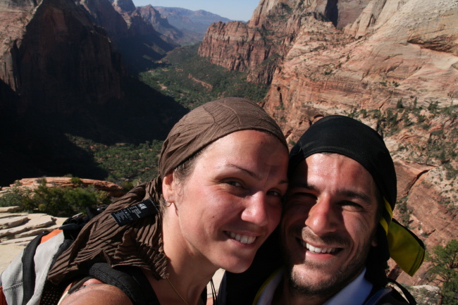 Nous allons au visitor center pour nous aider à sélectionner la rando que nous allions faire. Il nous conseille Angel’s Landing que nous avions également préselectionné. Nous préparons notre pique nique et nous nous rendons à l’arrêt de bus car la voiture est interdite au delà de Canyon junction. Les paysages sont incroyables. Notre bus tombe en panne, réparation à l’américaine, 5 minutes plus tard un autre bus remplaçait celui en panne. Nous nous arrêtons à l’arrêt Grotto où démarrait la rando. Cela commence doucement mais pas pour longtemps. Nous apercevons du monde sur une falaise rouge, jamais je n’aurais imaginé qu’un chemin passe par là et pourtant si… c’était notre chemin. Ca monte sec !!! C’est fatiguant car la montée est assez abrupte, les paysages sont jolis, avec Yoann nous essayons d’avoir un bon rythme. Heureusement le trajet est encore ombragé, il est 9h30, nous arrivons à un premier lookout où il y a pas mal de monde. C’est le moment où il reste 0,5 mile le long d’une crête avec le vide à droite et le vide à gauche… Il faut s’accrocher à certains moments à une corde métallique. Il vaut mieux ne pas être sujet au vertige… Ca grimpe bien, la difficulté supplémentaire c’est que nous croisons sans cesse des personnes qui descendent. En tout cas, la vue est superbe, vraiment splendide. Nous continuons jusqu’à l’arrivée et là c’est grandiose. Lookout qui se mérite mais qui est superbe !!! Nous nous posons pour admirer la vue magnifique. La montée nous aura pris 1h15. Puis nous entamons la descente qui s’avère fastidieuse car une foule de personnes montait. Nous finissons la partie pavé en courant. J Nous retournons à Grotto vers 12h, nous nous désaltérons et reprenons le shuttle. Nous arrivons au temple de Sinawara, terminus du shuttle et nous entamons la balade Riverside Walk en compagnie de beaucoup, beaucoup de monde… Cette balade longe la Virgin River. Au bout du chemin commence la rando « The narrows » sur le lit de la rivière… une foule de personne l’empruntait. Nous ne sommes pas équipés pour… Ca avait l’air joli. Au retour nous croisons pleins d’écureuils qui devaient être habitués à être nourris par des hommes…pfff…. Nous déjeuner à l’arrêt Sinawara puis nous reprenons le shuttle, nous nous arrêtons à l’arrêt Bid Bend pour le panorama, nous voyons des mecs faire de l’escalade sur cette énorme falaise. C’est hallucinant. Nous reprenons le shuttle. C’est magnifique. Encore une fois, ce parc est totalement différent de tous les autres précedemment visités. Nous retournons au Visitor Center et allons à la voiture, soulagés d’enlever nos chaussures. Il est 15h lorsque nous quittons Zion, nous décidons tout de même d’aller au Grand Canyon. La route est un peu longue mais avec yoyo bolide, cela passe plutôt vite et changement d’heure oblige entre Utah et Arizona, nous gagnons 1h. Il est 18h quand nous arrivons au Grand Canyon. Après avoir passé l’entrée Est du parc et après s’être perdu. Nous trouvons le camping de Desert view avec le système premier arrivé, premier servi, et bien nous avons fait le tour et il était plein. Nous croisons une ranger à l’entrée, nous lui demandons où nous pourrions dormir et elle nous répond que tout est full à 80 miles à la ronde. C’est la merde… Au bout d’un moment elle nous dit il y a peut être un endroit, 12 miles à gauche après le camping en allant vers Grand Canyon il y a une bifurcation vers l’Arizona Trail qui se trouve dans le Kaibab National Forest (et donc pas dans le parc) et là vous pouvez camper gratuitement. Nous allons mettre de l’essence et nous décidons de chercher l’endroit qui n’était pas du tout indiqué. Nous le trouvons et nous retrouvons dans une ligne droite dans la forêt, nous croisons 2 hommes qui s’apprêtaient également à faire du camping sauvage. Après avoir repéré les lieux, nous nous disons que nous reviendrons dormir là ce soir. Nous partons donc vers Canyon Village pour trouver à manger. Nous nous perdons un peu et nous retrouvons devant le Canyon Café où nous avons diné. Nous retournons à la forêt pas trop tard, je suis stressée, comme à mon habitude… Nous regardons Breaking Bad et nous couchons dans la voiture. Nous passons une nuit pas top top…