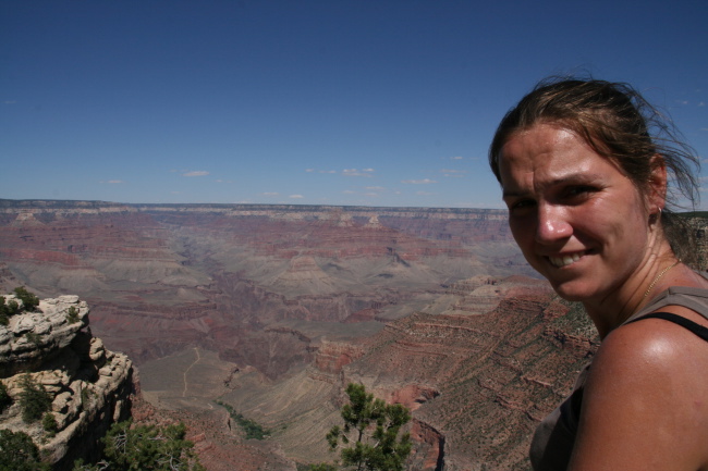 Nous nous levons aux aurores, il nous fallait vite trouver où dormir le soir, nous quittons notre forêt et nous dirigeons au camping de Canyon Village. Il n’ouvrait qu’à 8h, il n’était que 7h20… Nous décidons donc d’aller prendre douche. La douche prise nous retournons au camping et le mec nous dit « FUUUULLLLL » L à part les résas « c’est le labour day », c’est bon nous avons compris, il nous conseille d’aller voir les autres dont celui de Tusayan (Ten X). Nous y allons illico presto. Arrivés là bas, nous voyons écrit FULL, je stresse, yoann nous conseille de faire le tour et là nous trouvons un emplacement vide, les voisins nous confirment que les personnes sont parties. Youhou !!! Nous nous empressons de monter la tente et nous installons. Nous quittons le camping et allons vers Canyon village où nous nous disons que nous allons passer une journée tranquilles. Nous passons au back country office pour réserver une nuit au fond du canyon et là le ranger m’a trop stressé ! Il nous a fait pleins de mises en garde, « en été c’est dangereux », « il fait trop chaud », ça m’a stressé à tel point que je ne voulais plus le faire. Nous allons petit déjeuner au Canyon Café, je n’arrivais pas à m’enlever le stress. Au bout d’un moment je croise une fille qui a fait l’aller retour dans la matinée via le South Kaibab trail en 5h… elle m’avait l’air plutôt en vie… J Ca me rassure un peu, en parallèle yoann réserve deux nuits au Venetian à Las Vegas. Nous allons au visitor center, je voulais me rassurer auprès d’un autre ranger, je lui explique la discussion du matin, et il m’a rassuré en me disant que il s’agissait juste de mises en garde pour les fous qui partaient vers 10h du mat en voulant faire l’aller retour. OK nous ferons cette rando ! Nous décidons avec Yoann de faire la Hermit Rest Road uniquement desservi en shuttle, la queue pour le shuttle à l’entrée de la route est trop importante, nous commençons donc à pied. Nous allons d’abord à Trail View point, qui comme son nom l’indique donne sur le Bright Angel Trail… ça promet, ça à l’air super long… Nous allons ensuite au MAricopa point, les vues sur le canyon sont magnifiques ! Nous reprenons le shuttle, et nous arrêtons ensuite à Mohave point où nous avons une vue sur la Colorado puis nous marchons sur le Rim trail à même la falaise c’est impressionnant, nous allons jusque Abyss Point. Puis nous reprenons le bus jusqu’au Terminus Hermit Rest. Nous restons dans le bus pour être sur d’avoir une place pour le retour même si cela n’a pas l’air de plaire trop au chauffeur. Nous faisons le trajet retour, je contemple le grand Canyon et yoyo roupille. Le grand Canyon est vraiment impressionnant, démesuré à l’échelle de ce pays. Arrivé à l’arrêt de bus, nous allons au Bright Angel Lodge gérant le phantom ranch (en bas du canyon) prendre des infos pour la nourriture. Nous choisissons le repas de 17h le lendemain. Nous n’y dormirons pas mais nous y mangerons. Nous reprenons ensuite la voiture et allons faire des courses pour préparer la rando. Nous faisons les courses à Tusayan de quoi préparer les sandwich et le petit déj. Nous rentrons au camping pas trop tard, nous commençons à lister tout ce dont nous avons besoin. Nous préparons les sandwichs et la popotte. Notre voisin d’en face que nous avions croisé le matin nous demande très gentiment de venir le rejoindre avec sa copine pour aller autour du feu. Nous acceptons son invitation pour plus tard. Nous dinons et terminons nos préparatifs, nous les rejoignons. Ils s’appellent Max et Jenna, ils ont 22/23 ans et viennent de Santa Monica non loin de Los Angeles (ils nous proposent l’hospitalité ça peut être intéressant…), ils nous préparent une spécialité locale : « smarts » : cracker (espèce de petit beurre), chocolat, chamallow fondu au barbecue. Un petit sandwich diététique… trop bon. Nous discutons avec eux. Moi qui ne voulais pas rester trop longtemps… Bilan nous sommes rentrés vers 22h et dodo.