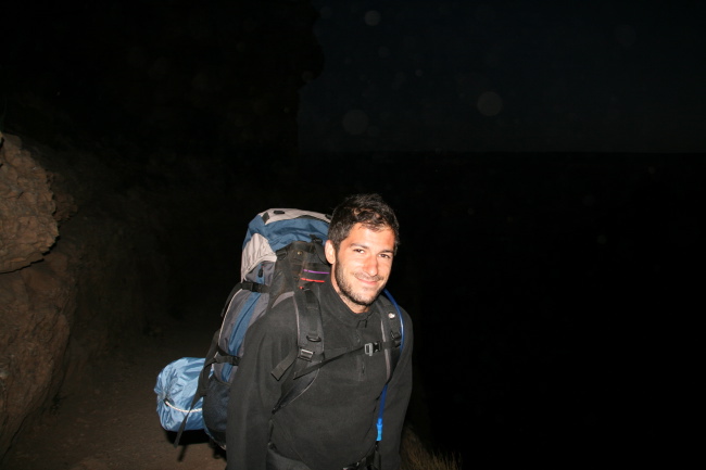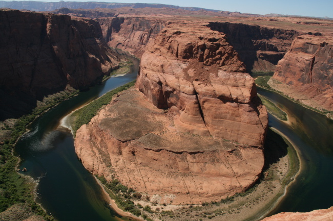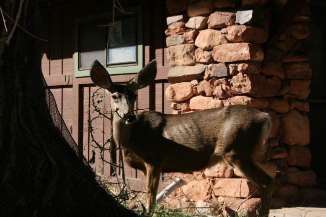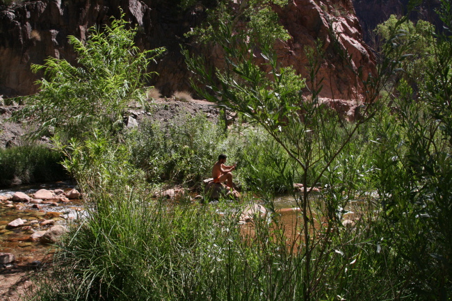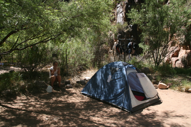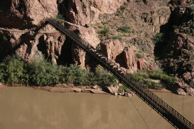 Lever 4h du mat, c’est dur dur. Nous plions le camp vite fait et nous partons direction le backcountry office où le bus nous prendra à 5h. Nous arrivons vers 4h40. Nous finalisons nos sacs, nous voyons mal pal de monde c’est rassurant, nous petit déjeunons dans le bus qui nous emmène au début du South Kaibab Trail. Nous arrivons vers 5h20, il fait nuit, nous sentons que le jour n’est pas très loin. Yoyo est bien chargé avec la tente, couette, nourriture… pour ma part j’ai 5 litres d’eau. Nous empruntons le sentier vers 5h30, nous ne sommes pas seuls… Petit à petit la lumière éclaire le canyon. Le panorama est grandiose. Au programme du jour que de la descente, nous descendons à un rythme cool, nous nous arrêtons pour prendre des photos, de temps en temps nous croisons des personnes qui remontent, ils ont l’air fatigué, ça promet pour le lendemain. C’est vrai qu’il fait chaud, nous continuons notre descente qui se passe plutot bien ma foi. L’arrivée se rapproche et les douleurs aux pieds s’accentuent, c’est chiant que de la descente, nous voyons des mules qui descendent aussi, nous arrivons au pont qui travers le colorado, c’est impressionnant. Nous traversons le pont après les mules, l’arrivée n’est plus très loin. Nous passons à nouveau un petit pont pour aller au camping, nous sommes accueillis par des biches, trop mignon, il ne nous restait plus qu’à trouver un emplacement, je vais guetter et propose le 26, yoann valide, il avait l’air ombragé et le sol est assez plat. Yoann monte la tente et moi j’applique scrupuleusement la consigne de ranger toute la nourriture dans les boites en métal pour ne pas se faire voler par les écureuils. Nous sommes arrivés à 9h45, soit 3h15 de descente, nous pensions nous ennuyer mais en fait le cadre est magique, une petite rivière coule à côté du campement, yoann bouquine sur son rocher, moi j’opte pour une petite sieste. Ca fait du bien de se poser et de n’avoir rien à faire. Au réveil, nous déjeunons puis au tour de Yoann de faire la sieste, je suis allée me baladée au bord du Colorado, c’est assez boisé, une bonne odeur de figue sur le chemin, vraiment sympa mais très chaud. Après nous passons l’après midi à bouquiner pour ma part au bord de l’eau et Yoann tantôt dans l’eau, tantôt hors de l’eau, c’était génial, ça aurait été vraiment dommage de ne pas le faire. Je crois un écureuil avec une barre de céréales dans la gueule, notre voisin qui n’a pas fermé sa boite… Nous partons nous balader en fin d’après midi, nous apercevons une biche et son petit. Les couleurs du Colorado sont très belles. Nous sommes ensuite allés au Phantom Ranch pour diner vers 17h30, en y allant nous repassons au camp, un ranger est venu nous parler, je suis stressée par le bulletin météo du lendemain : risque de thunderstorm, le ranger n’avait pas trop l’air au courant. A ce moment là je me rends compte que le diner est à 17h, nous nous pressons et arrivons vers 17h30. Tout lemonde est à table. Le repas est correct mais ça donne le sentiment qu’il faut gober, le service suivant est à 18h30. Au menu, steack, petit pois, mais, salade, pain fait avec le crottin de la mule (en tout cas ça donnait l’impression) et un gateau au chocolat. J’ai le temps de boire un peu de thé mais nous nous faisons vider à 18h. Première fois que nous dinons et qu’il fait jour J. Nous retournons au camp nous bouquinons. Je demande au voisin s’il peut nous réveiller vers 5h car mon tel n’a plus de batterie. Des gens continuent d’arriver, c’est fou ils ont du mourir de chaud. Nous ne couchons vers 20h, il fait une chaleur de fou, nous dormons la tente ouverte. Malgré l’absence de matelas, le lit est confortable, je me réveille à plusieurs reprises pendant la nuit, j’appréhende de ne pas me réveiller. J’aperçois pas mal de loupiotes de bon matin enfin je devrais dire de bonne nuit. J’en déduis que c’est l’heure de partir. Ce qui me stresse c’est que les gens commencent à partir… je me lève pour demander l’heure au voisin, il est 4h30, je réveille Yoann, il est temps de lever le camp.