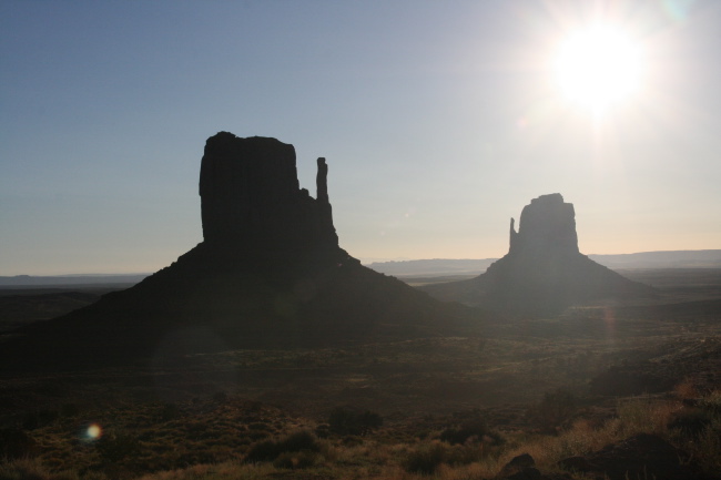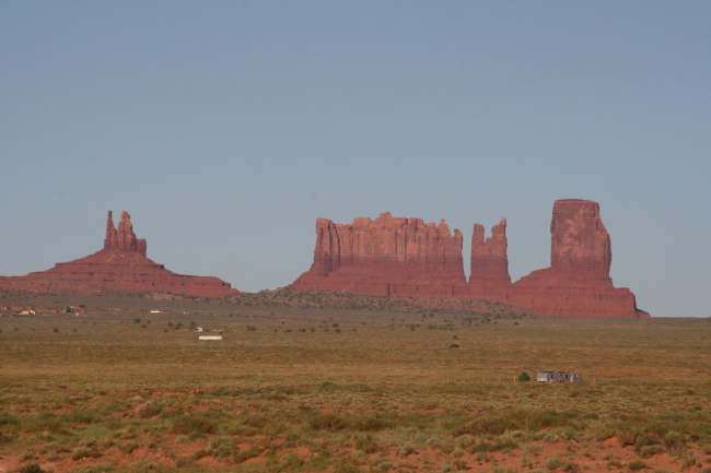 Comme je le disais plus haut, nuit horrible, en plus d’être à plat sur le sol, nous nous sommes faits chiquoter par les moustiques. Lever 7h, nous remballons toutes nos affaires et nous rendons au point de départ de rando « Squaw Flat », nous nous trompons une première fois. Nous croisons un ranger qui nous donne quelques conseils. Nous commençons la rando vers 8h30, les lumières étaient très belles. La première partie de la rando se fait par le Big Spring Canyon où nous voyons de gros champignons hamburger. Trop bien. Il fallait toujours faire très attention aux cairns. Nous apercevons les Needles, point fort de Canyonland, nous traversons le canyon, c’est somptueux. Pendant un moment nous ne croisons pas âmes qui vivent, surtout durant la deuxième partie qui s’est révélée être un peu compliquée. Au bout d’un moment, nous perdons totalement les traces, impossible de trouver un quelconque tas de pierres… Nous errons, nous croisons finalement des québécois au moment où nous retrouvons des pierres. Les québécois avaient fait la première partie (sens inverse de notre boucle) et nous ont dit que c’était un peu décevant et monotone. Cela s’est révélé assez vrai : monotone et très difficile de voir les cairns. Si bien qu’à un moment donné, nous avons vraiment galéré, et nous avons fini par prendre un chemin sans être surs… Finalement au bout de longues minutes, nous voyons un panneau qui nous conforte sur le chemin. Le système de cairns est angoissant car il suffit d’une tempête pour effacer les traces et les randos dans les canyons sont compliquées car il est difficile de se repérer tant tout se ressemble. Nous sommes arrivés au point de départ vers 13h, soit 4h30 de marche alors que la ranger nous avait parlé de 3h. Nous étions heureux d’enlever nos chaussures. Je propose à Yoann d’aller vers Pothole point et Big Spring Canyon Overlook, Yoann n’était pas chaud à cause de l’essence (et ce détail a de l’importance…), finalement nous y allons. Pothole point était sympa mais nous avions tellement mal aux pieds que nous ne voulions pas marcher. Le dernier lookout Big Spring Canyon n’était pas top top. Sur le retour, nous faisons une halte pique nique : bonne salade de concombre, tomate. Ça fait du bien. Nous finissons par un petit yaourt. Nous quittons Canyonland en nous arrêtant au Visitor Center pour récupérer les cartes : souvenir, souvenir… En quittant le visitor center, la jauge d’essence s’allume… Rappelons que la veille j’avais conduit pour aller à Canyonland :1) je n’ai pas tiré la sonnette d’alarme pour faire le plein alors qu’il ne restait qu’un quart, 2) J’ai roulé comme une malade… Il nous restait 80km à parcourir pour nous rendre à la pompe à essence… Franchement ça sentait la loose. La route du parc était très peu fréquentée, nous avons prié, Yoann a roulé à 2 à l’heure et se mettait au point mort dans les descentes : 1ère victoire lorsque nous réussissons à sortir du parc puis grande prière pour les derniers kms vers Monticello, première ville avec une pompe à essence. Nous roulions toujours au pas sur l’US 191, un peu dangereux tout ça. Finalement, alléluia nous sommes arrivés jusqu’à la pompe à essence. Nous étions sauvé… Nous continuons la route en passant pas Blanding (US191) puis Bluff (US163). Entre Bluff et Mexican Hat, nous quittons la route pour une piste « Valley of God Road» : Route splendide, un mini monument valley presque que pour nous. Nous nous retrouvons sur la 261 que nous suivant jusque Mexican Hat, où nous rejoignons la 163 pour aller à Monument Valley. Nous apercevons les rochers de Monument Valley, ça promet, c’est superbe. Nous décidons d’aller dormir non loin de là au Goulding’s Monument Valley Camps Park (nous apercevons le parc). Nous sommes en territoire indien, ici nous ne buvons pas. Nous allons faire quelques courses au Goulding’s Grocery, nous achetons de quoi diner poulet pané, pates et yaourt. Nous prenons une bonne douche chaude, nous dinons, les pates sont dégueulasses… Il est l’heure d’aller se coucher, nous avons une grosse journée…