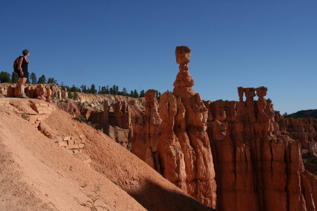 Je me lève à 7h, espérant prendre une petite douche au General Store mais cela n’ouvrait qu’à 8h. Je rentre bredouille. Je réveille Yoann, nous plions le campement et nous petit déjeunons, nous allons au visitor center pour nous renseigner pour les randos. Il nous conseille le Peckaboo Loop Trail et le navajo loop. Nous partons vers 9h pour une rando de 3h/4h. Nous partons de Sunset Point qui comme son nom l’indique est mieux au coucher de soleil, c’est déjà splendide. Nous voyons un ensemble de cheminées orangé, blanc, rouge , superbe ! Nous apercevons le marteau de Thor : trop beau. Nous attaquons la rando par le Navajo loop qui descend rapidement à travers les cheminées et le fameux marteau. Les couleurs sont grandioses, à la moitié du Navajo loop, nous repiquons vers le Peckaboo loop. Trail magnifique à travers les cheminées où l’on passe son temps à monter et descendre !!! Sur la descente, nous faisons des petites courses. De temps en temps nous croisons des chevaux car il s’agissait également d’un horse trail. Décors atypiques et vraiment somptueux… Puis nous rejoignons le Navajo loop, trail que nous terminons dans l’autre sens mais là c’était plutôt Eurodisney. Cela n’enlevait rien à la beauté de l’endroit. Nous arrivons à la voiture à 11h30 (soit 2h30 après être partis) et décidons de faire les look out du parc. Natural bridge est atypique avec ce pont naturel superbe. Le plus impressionnant est le Bryce point. Sublime avec un panorama superbe sur toutes les cheminées. Nous déjeunons sur une aire de pique nique et finissons par Bryce point et Inspiration point. Nous retournons au General store pour prendre une petite douche, comme nous n’avions qu’un shampoing, j’en ai donné une noisette à Yoann. Nous allons donc chacun dans une douche (homme /femme séparés), arrivée à la douche je me rends compte que c’est payant avec des pièces spéciales. Je ressors et je retrouve avec du shampoing sur les cheveux…C’était bien marrant, je vais chercher les fameuses pièces et retrouve Yoann toujours aussi « ridicule », j’en ris autant. Nous prenons notre bonne douche et allons au general store où nous trouvons 20dollars par terre. J Nous repartons vers 16h. Nous repassons au visitor center pour voir si l’entrée Est du Zion park est ouverte. La réponse est affirmative, cool, nous voilà partis pour le Zion National Park pour environ 1h30 de route. Arrivés vers Zion, la route est en effet ouverte mais les travaux font qu’il ya plusieurs points d’arrêts. De plus contrairement aux autres parcs, il y a énormément d’affluence, ce qui n’est pas bon signe. Nous arrivons au South Campground et là : FULL, nous nous dirigeons vers le Watchman campground et nous faisons la queue pour finalement s’entrendre dire : full ! La galère commence. Le ranger nous a tout de même indiqué qu’il y avait un camping sauvage au mile 24 (non indiqué). Nous nous arrêtons tout de même au Quality Inn et là même rengaine. Et nous voilà sur la route… Il n’y avait rien à part des Motels et Bed and Breakfast… Puis plus rien, l’inquiétude grandit. Au bout d’un moment yoann me montre où les miles sont indiqués et nous guettons. J’aperçois des personnes dans un champs, et me dit c’est peut être là . Nous voyons la borne 23 et nous faisons donc demi tout et là en effet, nous empruntons une piste où nous croisons des gens et des tentes. Je me renseigne, trouve un français et il me confirme que c’est free et qu’on a qu’à se mettre où on veut. Nous cherchons un emplacement au milieu de rien. Nous installons notre tente. Nous nous retrouvons avec une famille style chetan où il ya 16 enfants et une femme naine, trop bizarre. Un homme passe et nous conseille de ne rien laisser dans la tente. C’est rassurant J. Bolenat. Pour l’anecdote, nous sommes en plein long w-e de la fête du travail, ca promet pour le grand Canyon… Bolenat. Nous prenons l’apéro et préparons la popote. Nous dinons un super riz et poulet. Génial !!! Du monde continue à arriver alors qu’il fait nuit noire. Il fait très chaud. A tel point que nous décidons de faire tête bêche, yoann voulait de l’air près de l’entrée. Nous n’avons pas dormi tip top et nous levons à 7h30…