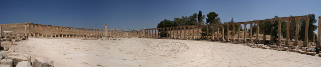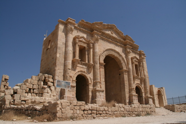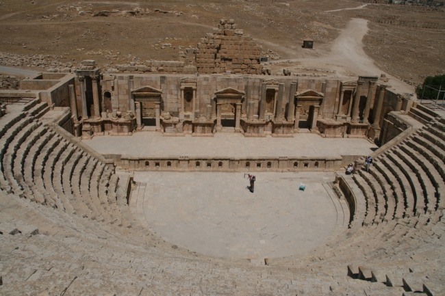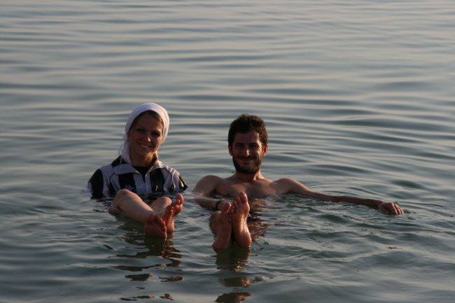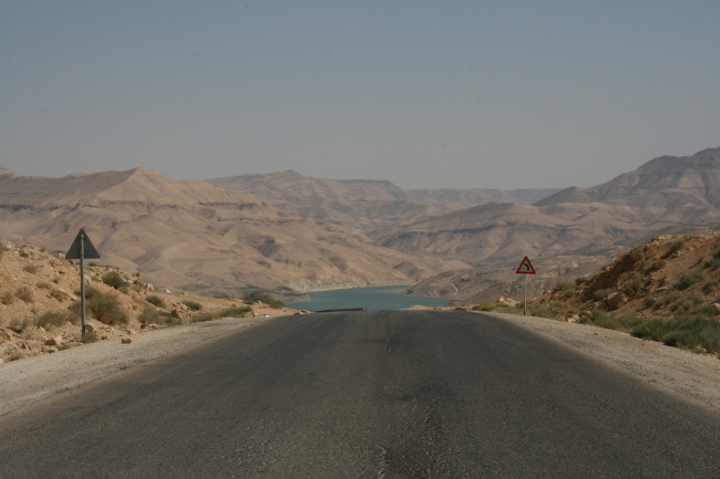 Nuit bercée par la voix du Muezzin, petit déjeuner vers 8/9h et préparation avant le départ. Nous changeons de l’argent et c’est parti pour Jerash, nous trouvons le site sans trop de difficultés (Madaba – Jerash : 1h), on se croirait presque à Rome avec une chaleur un peu plus étouffante. Les sites que nous avons préféré sont les théâtres ainsi que le forum, le temple de Zeus. Nous sommes restés environ 2h. Puis j’ai eu la grande idée de faire une boucle pour ne pas refaire le même trajet qu’à l’aller. Nous repartons donc vers Ajlun dans la cacophonie de la ville. Nous avons faim et décidons de nous arrêter manger un chawarma avant d’arriver à Ajlun. Trop bon ! Le monsieur nous a même donné des falafels et des morceaux d’agneau. En tout cas nous en avons pour 5JD à 2 soit environ 5euros. Nous repartons vers le château d’Ajlun que nous contemplons de l’extérieur. Puis nous repartons vers Kufrinjah à travers les montagnes, le panorama en arrivant sur cette ville est superbe. Nous nous perdons à Kufrinjah et nous demandons vraiment si c’était vraiment une bonne idée de faire la boucle… Nous sommes lancés et demandons donc le chemin vers El balawina, les jordaniens sont plutôt cool pour expliquer les directions. Nous reprenons la route et tombons sur un poste de police avec mitraillette et tout et tout… RRRrrrRRR. L’angoisse monte, ça me stresse, nous traversons des paysages de montagnes désertiques. Magnifique ! Nous reconnaissons les rives du Jourdain, ouf la délivrance n’est plus très loin. Nous longeons le Jourdain pendant un moment. Nous nous dirigeons vers la Mer Morte. Cette partie du pays est un peu plus verte. Nous trouvons facilement notre chemin pour la Mer Morte, c’est fou ce lac ! Nous nous arrêtons au Amman Tourist Beach, qui est blindée de locaux et bourkas…RRRrrr. Nous avons voulu nous la jour cheap… Je met une éternité à me changer et je décide de me baigner avec le maillot de foot de Yoann. C’est tout de même très drôle de flotter de cette façon, cela nous a moins brulé qu’au Lac Rose (Sénégal). Pour la douche, je préfère passer mon tour, trop chiant. Nous remontons dans la voiture pour aller voir le coucher de soleil depuis le Dead Sea Panoramic Complex. La route est belle et nous assistons à un magnifique coucher de soleil sur la Mer Morte avec en face Jerusalem. Du coup, nous terminons le trajet de nuit, Yoann m’impressionne, il retrouve son chemin pour l’hôtel comme un chef.