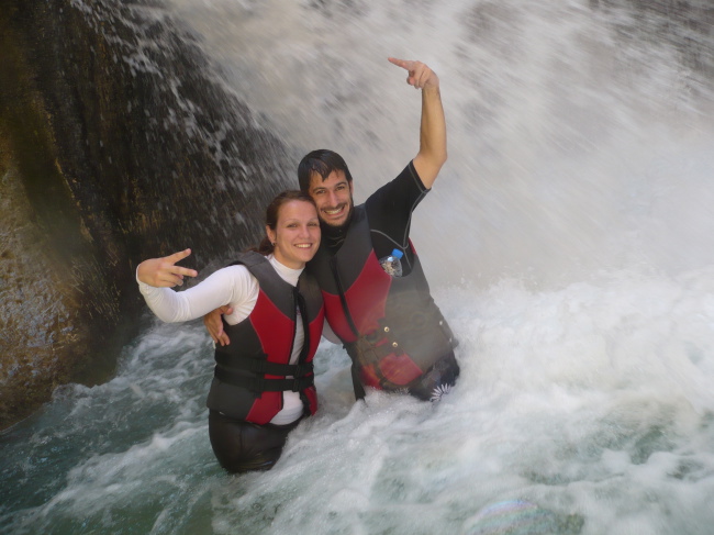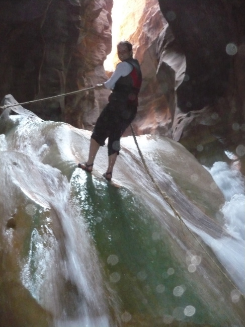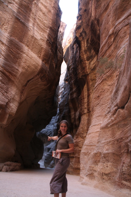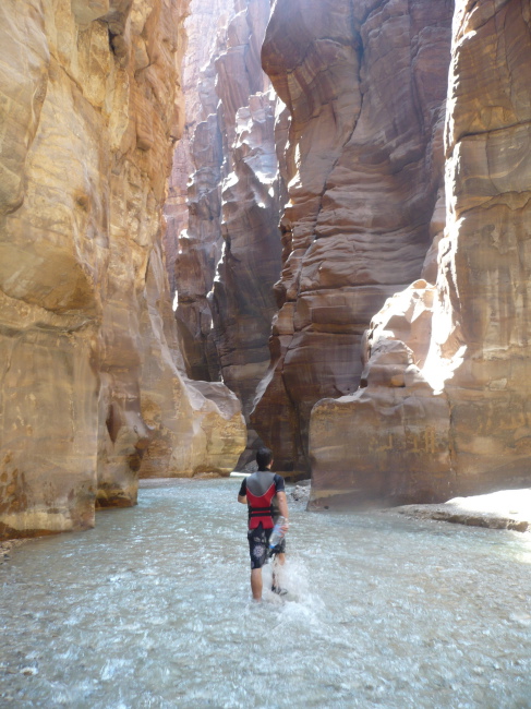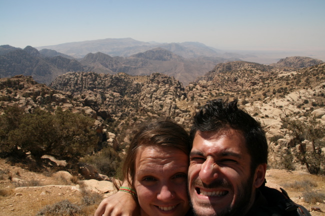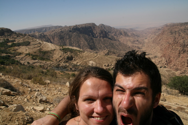 Nous nous dirigeons vers le Mont Nebo, la route est très jolie, à tel point que nous ratons le Mont Nebo. Nous faisons demi- tour et nous nous affranchissons de notre droit d’entrée à 1JD/pers. Il y a pas mal de groupes mais la vue est superbe… Nous repartons direction la Dead Sea, route magnifique qui nous remonte tout de même assez haut sur la Mer Morte, nous la longeons jusqu’au Wadi Mujib bridge et nous arrêtons au Visitor Center. Nous nous inscrivons au Siq Trail qui longe le Canyon (16JD/pers), ils nous prêtent des gilets de sauvetage, nous enfilons nos superbes chaussures de marche dans l’eau et c’est parti ! Le trajet est superbe, nous avons les pieds dans l’eau dès le départ, le Canyon est magnifique, nous ne sommes pas seuls mais profitons bien du lieu. Quelques points un peu délicat sur le parcours : grimper le long de petites cascades avec des cordes, il y a 3 ou 4 passages comme ceux là, les locaux nous aident, ambiance très sympa. Nous arrivons à la fin du trek sur une grande cascade (c’est un peu plus babylone), nous immortalisons le moment avec un local (Jamal) et ses amis, nous prenons des photos d’eux. Nous faisons le trajet inverse en les suivant, ils nous montrent comment prendre les cascades en toboggans, c’est trop cool. Franchement c’est une super rando, l’eau est chaude contrairement à ce que nous aurions pu croire. Nous retournons à l’entrée, nos clefs de voiture nous sont rendues. Nous nous changeons et c’est parti. Nous revenons sur nos pas car nous ne voulions pas rater la route des rois. Nous reprenons donc le chemin le long de la Mer Morte vers le Nord et prenons la transversale vers Madaba que nous quittons rapidement vers Mukawir. Les paysages sont encore une fois incroyables avec d’énormes descentes et montées, franchement c’est très très beau, nous passons à côté des sources d’eau chaude de Hammamat Ma’in. Nous n’avons pas le courage de faire la petite rando finale pour monter au sommet du Mukawir. Nous repartons, passons par Libb, Dhiban, nous espérions trouver à manger en vain… Nous achetons un petit paquet de chips, ce n’est pas gagné. Nous repartons et à l’approche de la vallée du Mujib, les paysages deviennent totalement incroyables, superbes, splendides. Nous apercevons le barrage du Mujib avec une eau d’une couleur bleue intense qui se démarque de la couleur sable de la roche. Nous entamons la descente puis remontons. En remontant, nous croisons un petit « café restaurant » : le grand Canyon. Yoann qui est affamé, s’arrête, la vue est superbe. Sami apparaît et se met tout de suite à nous tchatcher, nous sommes sur la défensive. Ils nous montrent ses toilettes incroyables donnant sur la vue magnifique. Ils nous présentent ces amis/familles, il nous sert thé, café et petits gâteaux. Je reste assez méfiante et me demande bien quelle note salée il va nous sortir… mentalité d’occidentaux L… Sami nous raconte sa vie, son ancien métier dans l’US Air Force, sa femme décédée, son envie de monter un campement. Petit à petit, je me rends compte que cet homme est juste très accueillant, et je gâchais ce pur moment à cause de ma méfiance. Nous lui demandons combien nous lui devons et il nous répond que c’est gratuit. J’essaie maladroitement de lui dire que nous ne sommes pas habitués à autant de gentillesse « gratuite », il m’a répondu que la beauté du cœur est plus importante que tout l’or du monde… Il nous dit être heureux d’échanger avec nous, il nous conseille un endroit pour camper à Dana et nous laisse même un mot en arabe pour son ami. Nous immortalisons ce moment. Je me sens très gênée de ne pas avoir plus profité de ce pur moment d’hospitalité et de gentillesse. Après quelques hugs, nous revenons fort de cette nouvelle expérience. Nous repartons, passons par Kerak et son château, le soleil commence à tomber, les couleurs sont magnifiques. Nous continuons vers At Tafila, on se refait un petit moment essence où forts des conseils du mec de l’hôtel de Madaba, nous disons que nous voulons pour 15JD d’essence. Le mec papote avec Yoann qui comprend que le mec vient de Belgique alors qu’en fait il vient d’Egypte… c’est drôle. Le mec arrête de remplir quand le compteur arrive à 15litres et non 15 JD en essayant de nous dire que c’est bon. P… d’égyptiens ! Nous insistons et il remplit jusque 14,3 JD. Ok nous nous sommes tout de même améliorés. Nous reprenons la route, nous passons à nouveau à travers le paysage incroyable du Wadi Al Hasa, nous prenons quelques photos, c’est vraiment très joli. La route des rois tient vraiment toutes ces promesses. Puis nous revenons sur des routes plus classiques, traversant des villages plus ou moins animés. Nous traversons la grande ville d’At Tafila et continuons vers Dana. Nous hésitons à aller au Rummana Camp Site mais décidons finalement d’aller au Dana Village : village à moitié en ruines suspendu en haut d’une falaise. Nous nous renseignons au visitor center qui nous explique un peu les randos existantes. Nous choisissons l’hôtel Dana dans lequel il ya un groupe d’allemands. Ils nous proposent une chambre pourrie et nous demandons à dormir sur le toit. Ils acceptent. Cool. Cela nous coute 10JD/pers (diner inclus). Nous discutons avec l’allemand du groupe religieux puis avec 2 belges/flamands qui voyagent sac à dos pendant 3 semaines. Nous avons le droit à un super diner : pommes de terre, riz, chou fleur, aubergine, poulet, boulette de viande, salade, pain…. Trop bon ! Puis nous nous posons pour boire un thé, bouquiner. Que va donner notre nuit sur le toit ? Artung ! Un CAUCHEMAR : Impossible de dormir avec tous ces moustiques, l’HORREUR. A 2h30, nous sortons de la tente, dehors il y a du vent, on se sent mieux. Les mecs de l’hôtel ont pitié de nous et prononcent le mot magique de moustiquaires ! Nous capitulons et al