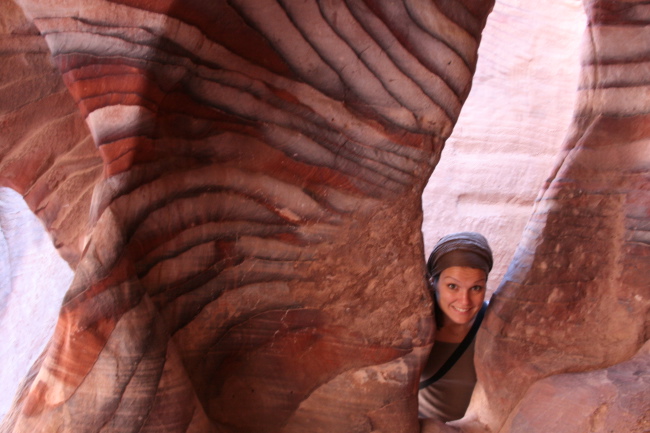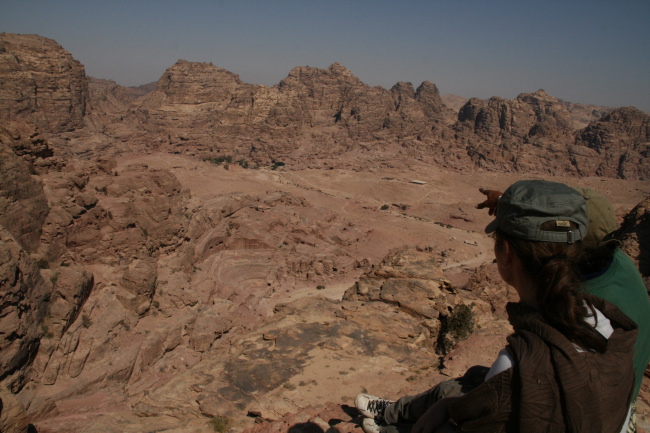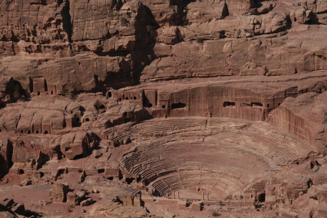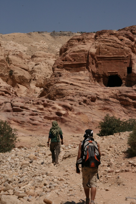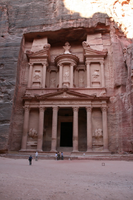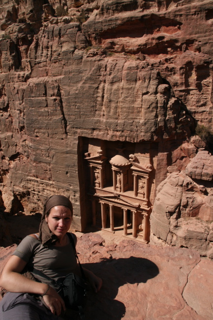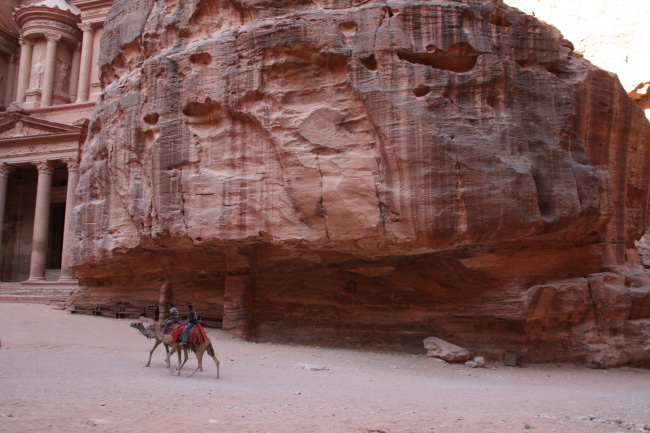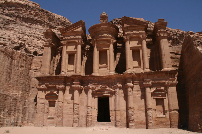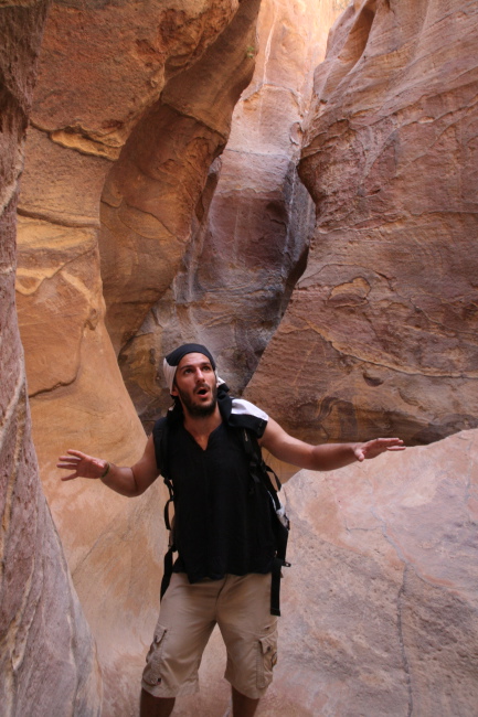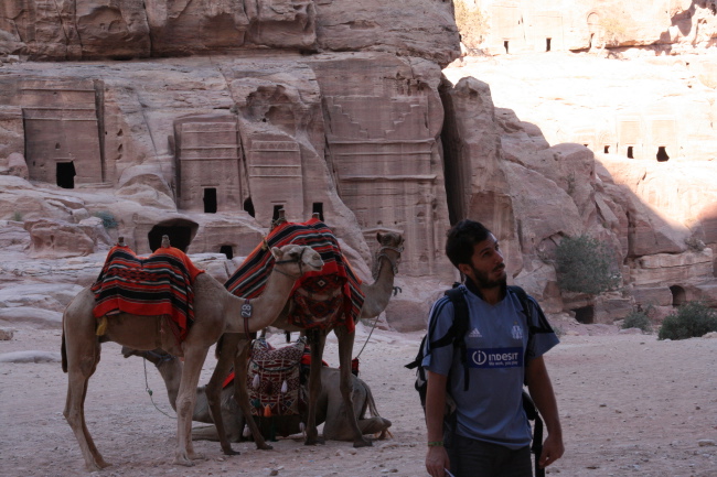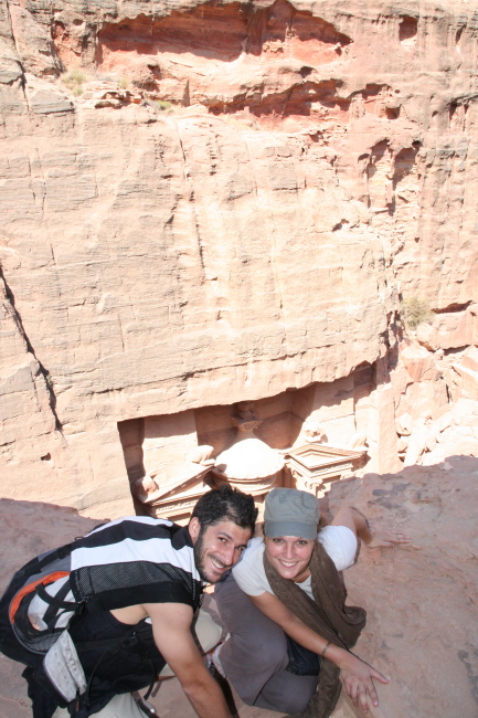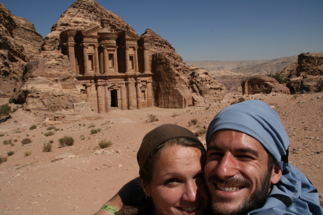 Réveil 6h ! Dur dur. Une grande journée nous attend. C’est de Petra que nous est venue cette idée de Jordanie. Nous allons au petit déjeuner que nous trouvons sommaire, nous prenons quelques « vache qui rit » pour notre pique nique. Nous nous équipons, c’est parti pour une belle journée. Nous allons au visitor center nous acquitter de notre droit d’entrée : 55JD/pers pour 2 jours, c’est un peu gonflé. Nous attaquons la marche, nous sommes sollicités pour faire de la mule chétive… non merci puis nous arrivons rapidement au Siq. C’est très beau, un canyon sans eau. Nous sommes quasiment seuls, ce qui est fort appréciable. Puis nous arrivons au premier joyau : le Kazhneh, SPLENDIDE. Très peu de monde, nous avons pu en profiter pour prendre quelques photos. C’est vraiment impressionnant. Nous restons un moment à l’admirer. Puis nous enchainons avec le tour habituel passant par la rue des façades (beaucoup de tombeaux), certains avec des dégradés de couleurs hallucinants. Beaucoup de bédouins avec leurs mules ou dromadaires, des magasins, des toilettes… ça ne gâche pas la beauté du paysage. Nous passons devant le tombeau d’Aneishu, ainsi que le théatre royal (dont la vue sera beaucoup plus impressionnante en hauteur). Nous passons ensuite par les Tombes Royales, c’est splendide. Le tombeau à l’urne est celui qui m’a le plus marqué. Nous avons ensuite bifurqué à droite après le tombeau palais vers le trail du haut lieu de Djebel Al Khubta, ça grimpe dur dur. L’objectif de ce trail est d’avoir une superbe vue d’en haut du Khazneh. Nous avons bien crapahuté, il est9h40 quand nous arrivons à la fin du trail. Nous profitons de la vue et surtout de l’ombre pour se rafraichir et se restaurer. Nous repartons vers le chemin normal en montant d’abord vers l’église byzantine connue pour ses mosaïques puis nous redescendons pour emprunter le cardo maximus (axe principal). Nous nous rendons au grand temple assez impressionnant où une femme à essayer de nous refiler des vraies ou fausses pièces de monnaie, les allées se remplissent et les bédouins sont de moins en moins « jordaniens ». Nous sommes exténués, le soleil tape très très fort. Nous nous arrêtons au Quasr El Bint, Yoann nous concocte des sandwichs « Vache qui rit » : super ! Nous en profitons pour nous poser un peu. Nous repartons et allons voir le château en ruine, nous allons ensuite au second point fort de Petra : le monastère Es Deir. Ca grimpe, ça grimpe… Nous sommes beaucoup sollicités pour monter sur des mules mais nous privilégions nos pieds. Es Deir n’est pas comme le Monastère, cela se mérite ! Sur le chemin, nous passons par le biclinium aux Lions. Après une bonne marche sous le cagnard, nous arrivons enfin devant le majestueux monastère qui ressemble au Khazneh en beaucoup plus imposant et un peu d’élégance en moins, quoi qu’il en soit c’est un énorme coup de cœur. Nous allons nous poser dans un salon bédouin sous la roche, Yoann prend un jus de citron menthe fraiche. Puis nous retournons crapahuter un peu pour aller voir des look out, sympas, mais après toute la beauté de la journée, nous devenons difficile. Nous nous trouvons un petit endroit calme à l’ombre pour admirer le monastère. Nous sommes fatigués, vers 16h/17h nous entamons le retour, tant pis pour le coucher de soleil. Nous faisons le chemin retour tranquillement en admirant toutes ces beautés, ils sont forts ces nabatéens. Arrivés à l’entrée, nous essayons de négocier un guide pour le lendemain, cela semble compliqué, le mec nous annonce des prix hallucinants dans les 120 JD… Nous partons, nous verrons demain… Nous mourrons d’envie de manger une glace, nous ne nous privons pas et allons chez Movenpick. Ca fait du bien. Nous rentrons à l’hôtel et prenons une bonne douche. Nous nous posons un peu et allons diner pizza/pates, puis en rentrant nous gravons nos photos sur un DVD. C’est l’heure du repos…