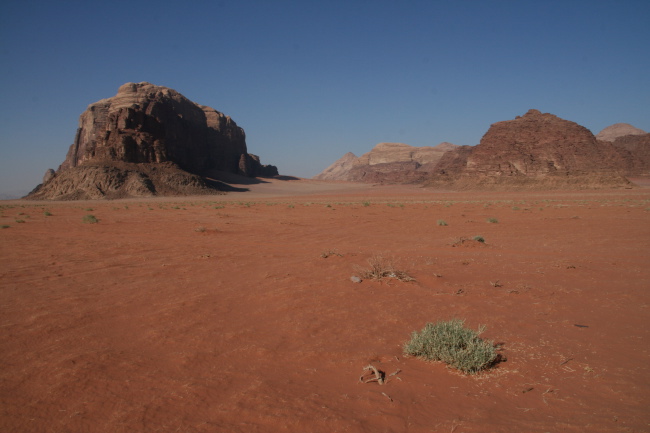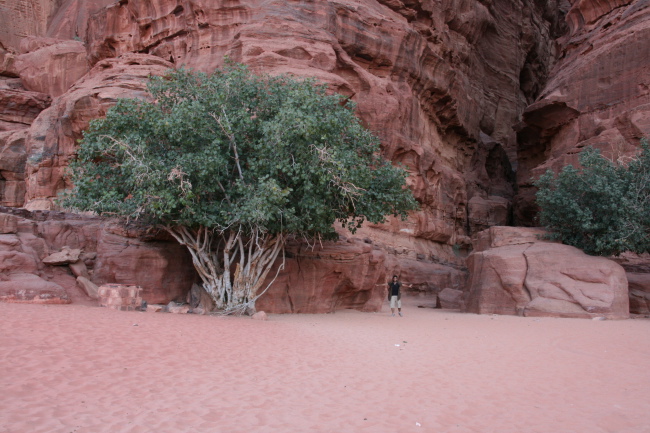 Lever avec les raclements de gorge de Salem. Nous petit déjeunons très sommairement. Franchement pas top. Nous enchainons la marche avec le frère de Salem, et oui Salem nous a prévenu qu’il ne pourrait pas être là. Nous ne partons pas dans le sens que m’a indiqué Salem et le problème c’est que son frère Motcla ne parle pas anglais Je commence à essayer de me faire expliquer mais nous ne nous comprenons pas et je lâche prise. Nous allons sur une immense dune magnifique. Il nous emmène voir des inscriptions qu’il ne sait pas expliquer, l’intérêt est vraiment limité. Nous marchons jusqu’au Siq Al Burrah (Canyon), nous nous y engageons seuls avec Yoann, ils nous donnent rdv 1h30 plus tard. Le problème c’est que nous attaquons cette marche vers 11h30 en plein cagnard. Du coup vers 12h30, nous n’en pouvons plus et faisons demi-tour. Ils ont eu la bonne idée de nous rejoindre dans le canyon, nous les retrouvons à l’ombre pour le lunch. Alors la lunch box, no comment : 1 boite de thon, 1 tomate (à moitié pourrie), un concombre à 2, 1 banane pourrie et des biscuits. Franchement nul ! Nous étions fatigués, et faisons donc une petite sieste. Nous nous réveillons vers 15h30 et redécollons vers 16h30. Une bonne pause bédouine. Nous avons marché jusqu’au coucher du soleil traversant des paysages variés avec des champignons. Ah j’oubliais, une jeep nous a suivi toute la journée et qui la conduisait : le fils de Salem de 8 ans… nous arrivons au bivouac qui est top : bivouac sauvage sous les montagnes. Nous commençons par un thé, entre temps Salem et un autre de ces fils nous ont rejoint. Puis nous débriefons, Salem nous réexplique qu’il ne sera pas là le lendemain. Motlak sera encore le guide et l’autre fils ramènera la jeep. Salem et le « 1er » fils rentre au village ce soir. Il nous explique le trajet pour le lendemain. Nous dinons un autre plat typique jordanien : « Sinia ». Super bon. En tout cas pour les diners c’est top. Nous nous couchons et là c’est le drame, il y a des moustiques. Malgré un changement de place, nous sommes harcelés toute la nuit. En plus la lune est restée haute donc pas de super ciel étoilé… L