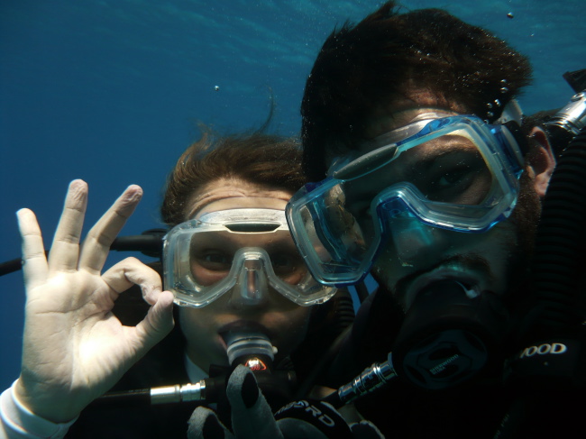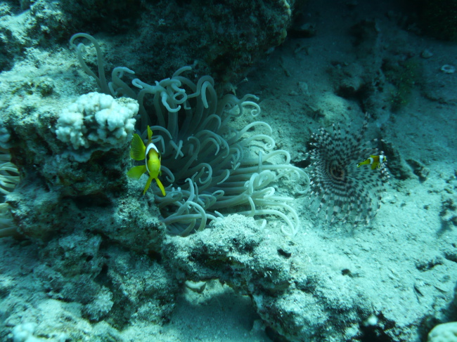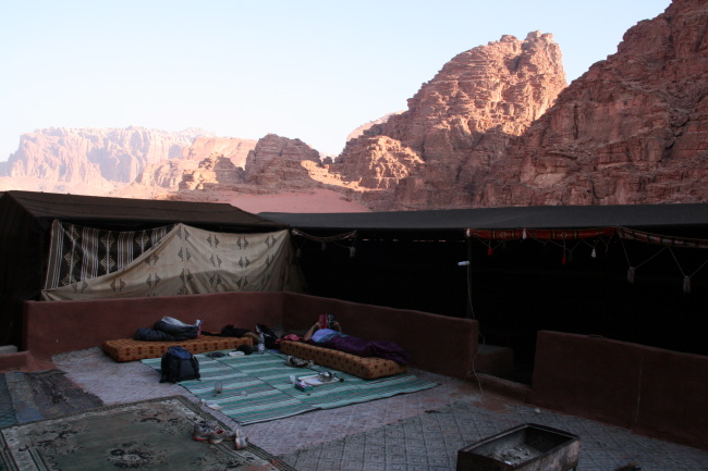 Lever 8h, nous faisons le checkout de l’hôtel et nous préparons pour la plongée. C’est parti pour le tank (celui vu l’avant veille en snorkeling). Le tank est plein de poissons lions. Trop beaux… du coup nous sommes restés un moment, le tank est totalement habité. Nous continuons et nous retrouvons au milieu d’une quantité impressionnante de coraux, de poissons, de bibis némos, de poissons pierre ! Plongée vraiment géniale. Nous rentrons vers 12h au club, nous nous douchons dans les douches des serveurs. Nous quittons Aqaba vers 13h, nous nous perdons à nouveau un peu en se retrouvant à 5km de la frontière saoudienne. Nous arrivons au Wadi Rum vers 14h10. Des hommes nous sautent dessus, évidemment je suis méfiante et appelle mon contact Mahmoud (c’est la seule activité prévue depuis la France). Je m’agace un peu, puis son « correspondant », notre futur guide Salem vient nous chercher. Nous passons sans prendre l’entrée et sommes allés prendre un thé chez Salem. Nous allons jusqu’à la Lawrence d’Arabie Spring. Rien à voir à part le beau panorama. Salem nous indique où marcher, nous repartons avec Yoann vers le Djebel Khazali, nous marchons tous les deux au milieu de nulle part, c’est joli. Nous arrivons à un camp et décidons d’aller marcher dans le siq. C’est très beau. Nous retournons au camp et buvons un thé. Nous repartons à pied vers une arche mignonne que nous gravissons. Nous remontons en voiture pour aller admirer le sunset. Salem nous propose à nouveau de marcher, je suis assez hésitante mais bon nous nous lançons avec ces explications. Bilan, il fait quasi nuit noire, nous ne trouvions pas le camp. Rrrrr. Finalement Salem est revenu nous chercher avec son 4x4. Nous arrivons au camp, l’inconvénient d’être dans un camp c’est que les toilettes sont en durs et franchement ça pue et les lieux ne donnent pas envie.