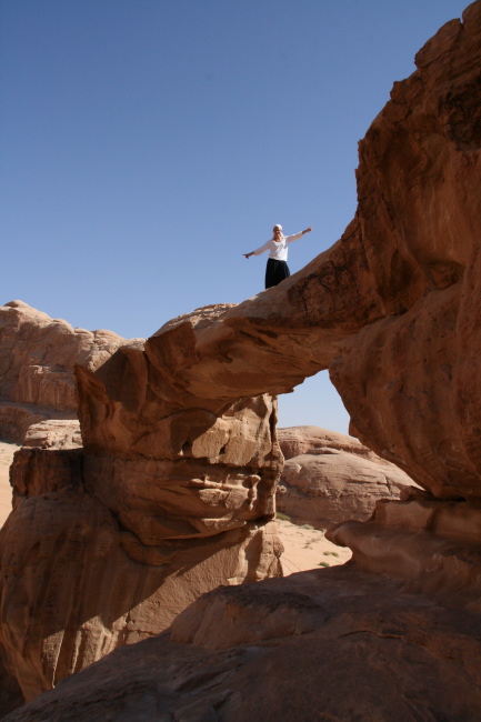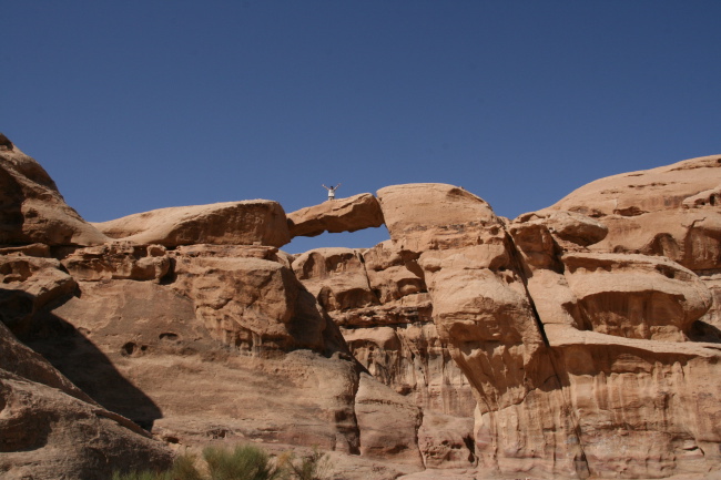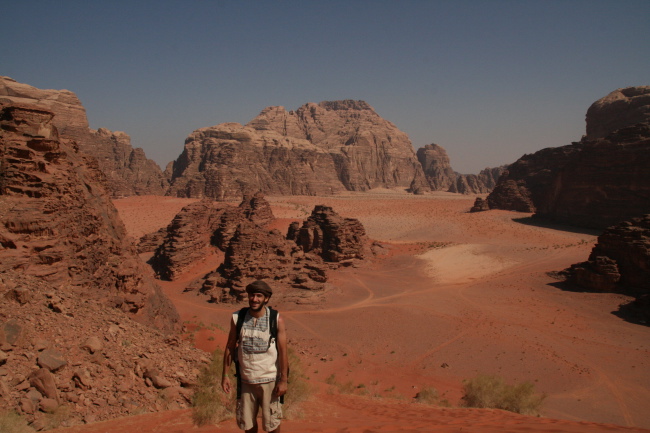 Lever 6h, nous réveillons Motlak et le petit… Ils préparent le thé et le « petit dej ». Le petit nous apprend qu’il est pressé car il doit aller à l’école… Ah c’est pour ça qu’aujourd’hui nous n’avons pas la jeep. Nous marchons avec Motlak, nous allons jusqu’au Burdah bridge que nous voyons de très très très loin et entamons un long périple vers Um Fruth. Le décor est superbe, sable allant du blanc au rouge. C’est vraiment très beau. Arrivés à Um Fruth, il y avait 2 français sur l’arche. Nous discutons avec eux, ils ont l’air sympa. Nous montons à notre tour. Comme d’habitude, il y a un salon bédouin et notre guide se détend. Après un long moment, nous repartons, notre guide nous propose de déjeuner à 10h30… nous déclinons. Nous avons continué à travers de superbes décors. Une jeep est tombé en panne devant nous (pauvre couple qui est dedans ils n’en ont pas fini). Nous continuons. Puis nous nous posons pour déjeuner vers 12h à l’arche non loin du Djebel Khazali. Le déjeuner est encore plus mauvais que la veille. Nous indiquons au guide que nous souhaitons que la voiture nous récupère. Evidemment, il ne comprend rien donc nous reprenons la marche et la voiture nous récupère quasiment à l’entrée du désert. Salem est venu, nous prions avec Yoann qu’il ne nous propose pas un thé chez lui. Ouf, il nous ramène à la voiture. Je lui donne notre dû et rien de plus. Il n’a pas l’air content… tant pis. Bref, vous l’aurez compris, le lieu est magique, majestueux mais notre expérience a été entachée par ces guides plus nuls les uns que les autres. Nous quittons Wadi Rum vers 14h. C’est parti pour 3h30 de route. Nous nous faisons une petite frayeur essence, on attend avec impatience de trouver une pompe à essence, nous avons le plaisir d’être servis par un africain qui très honnête nous sert les 10JD demandés. Après un trajet un peu long mais sans encombres nous arrivons à Madaba complètement poisseux. Nous sommes retournés au Black Iris avec son patron super gentil. Nous reprenons la même chambre. Nous nous faisons une bonne session décrassage + Rangement de valise. Nous avons une longue discussion avec le gérant de l’hôtel, nous lui racontons nos vacances, il nous raconte ses anecdotes, nous donnent son avis sur nos aventures. Très sympa. Nous étions affamés et il nous conseille un barbecue. Nous y allons, nous sommes servis d’un poulet quasi entier chacun, délicieux avec des épices, bien grillé avec du pain à la tomate + des légumes grillés. Trop bon ! LE tout pour 4,5JD. Nous revenons à l’hôtel et rediscutons avec le gérant. Il est vraiment sympa.